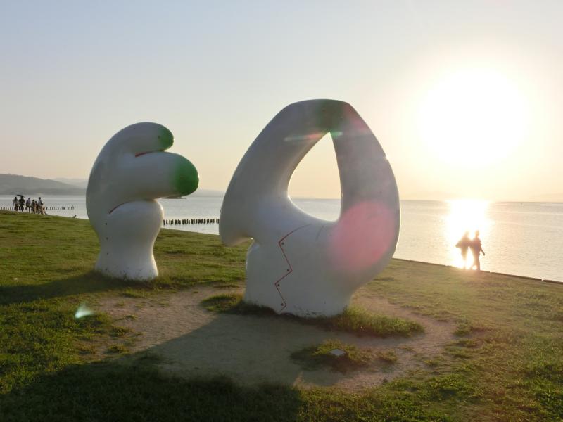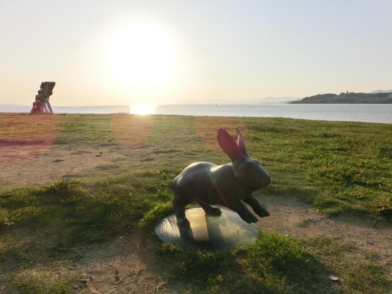 さて、ここからはバスに乗りましょう。そろそろ夕日の時刻なので、そのスポットを目指す人が多いのか結構混んでいる。10分ほど走り、島根県立美術館でバスを降りる。中に入ると、壁一面がガラス張りでその向こうに見えるのが宍道湖。夕日はかなり傾いてきて湖が眩しく光っている。外に出ると、芝生の上にはたくさんのウサギの像があった。宍道湖うさぎといわれるこのウサギたちも縁結びスポットとして有名らしい。ウサギ越しの夕日もきれいだな。美術館の前には他にもいろんなオブジェがあり、それを見ながら夕日スポットへと向かおう。