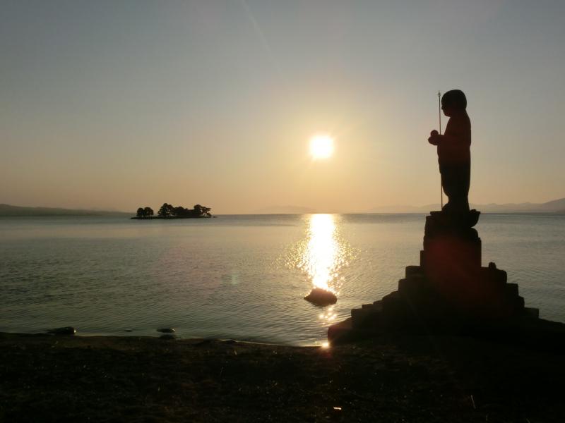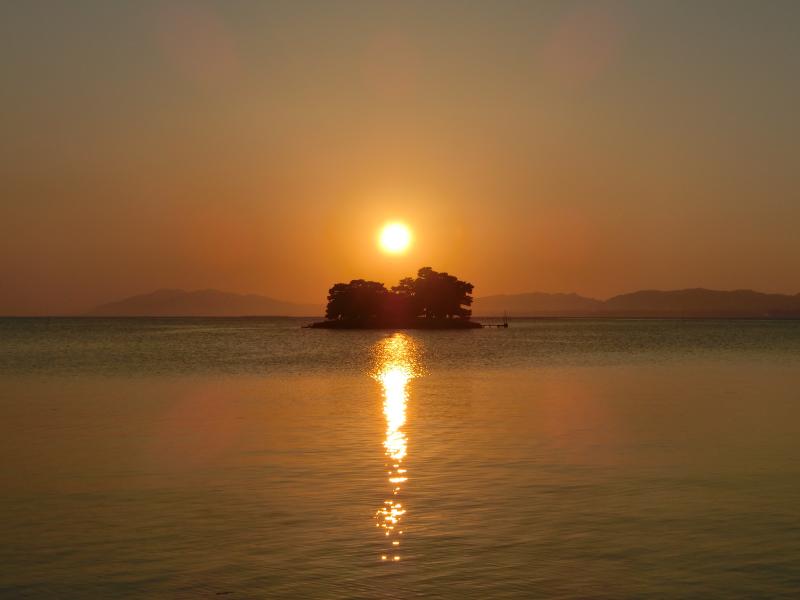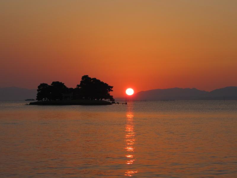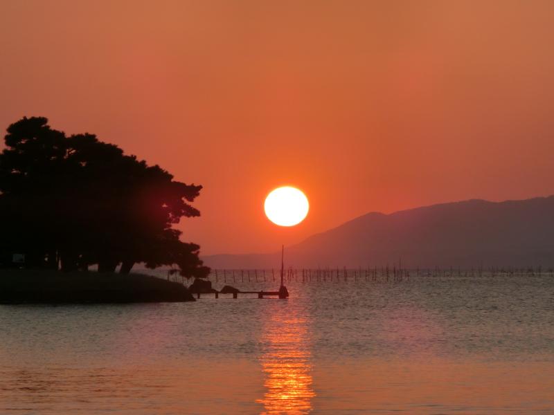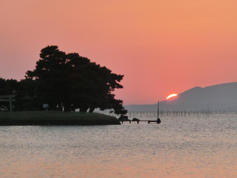 少し歩くと、人がたくさん集まっている場所がある。湖畔が階段状になっていて、そこから見ると湖の中にある嫁が島の上に夕日があってとてもいい感じ。夕日はもうすっかりオレンジ色で、その光が湖面に伸びていて、嫁が島のシルエットとともにとてもきれいだ。その夕日は徐々に島と重なってきて、松林越しに漏れるオレンジ色の光。今日は本当にいい夕日だなあ。少し場所を変えてみると、島の横に遠く夕日が見える。そして対岸の山に少しずつきれいに沈んで行きました。空の色は少しグレーも混じってきて、徐々に暗くなってきた。さて、そろそろ行きますか。渋滞のせいかバスが来るまで少し時間がかかったが、無事に最終のバスに乗れました。もうすっかり暗くなった中を走り、松江駅に戻ってきた。一旦ホテルに戻り、少し休憩。