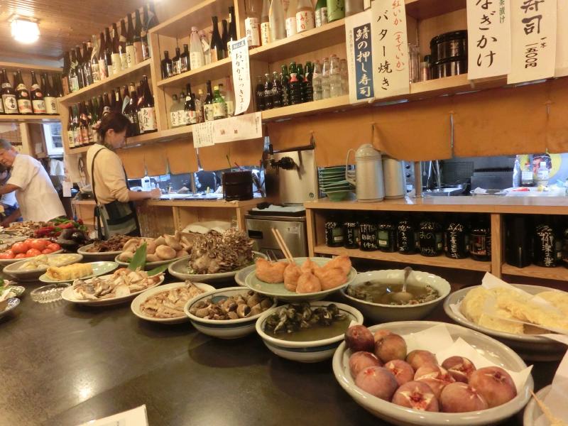 では晩ごはんへと行きますか。ホテルを出て、少し歩いたところに飲食店が集まっているエリアがある。どこもそろそろ賑わってくる頃のようだ。とある古びたビルの中にあるお店「てれすこ」が今日のお店。中に入ると、地元の人や観光客で賑わっているようだ。予約していたこともあり、カウンターの一番奥の席に案内された。広いテーブルの上にはたくさんの食材やお総菜が並んでいる。どれもおいしそうだな。まずは突き出しと島根の地酒をいただきますか。すっきりした辛口のお酒がいいですね。とりあえず気になったのが目の前にあった巨大なニンニク。これを焼いていただくことにしました。ほくほくで甘くて、これはおいしいですねえ。お刺身は白身を中心に、いかにも新鮮でお酒が進みます。さて、この季節の地のキノコといわれると、やっぱり舞茸を天ぷらでいただきますか。予想よりもたっぷり出てきたが、この香りがたまらないです。これでおなかも落ち着いて来たぞ。ではお酒を楽しみたいので、貝の盛り合わせでもいただきますか。たしか四万十でも食べたような、少し苦みのある貝がお酒と合う。あとはこの時期の島根といえばやっぱりのどぐろ、塩焼きでいただきましょう。のどぐろをこうしてちゃんと食べるのは初めてだが、小ぶりなのにしっかりした味わいでおいしいです。シメには蟹の入ったいなり寿司をいただく。一個がかなり大きめだな。お店のおじさんとのいい感じに話もできたし、ごちそうさまでした。
