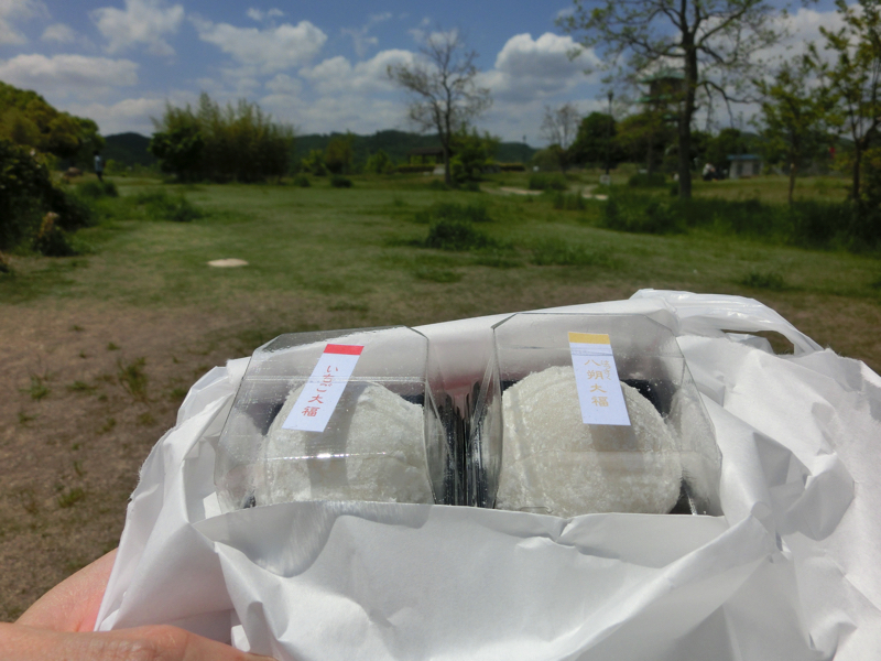 食後にはSAにあるドッグランをみよう。大きいのから小さいのまで、いろんな犬がいるぞ。元気に走り回っているのがかわいいな。車で移動しながらでもこういうところで走り回れると、犬も楽しいんだろうな。さて、もう一度中に入り、いちご大福とはっさく大福をゲット。少し奥の緑のところでいただきますか。では行きますか。岡山に入り、倉敷ジャンクションで瀬戸中央道へ。緑の中を走る。