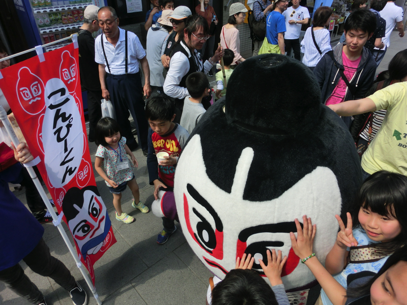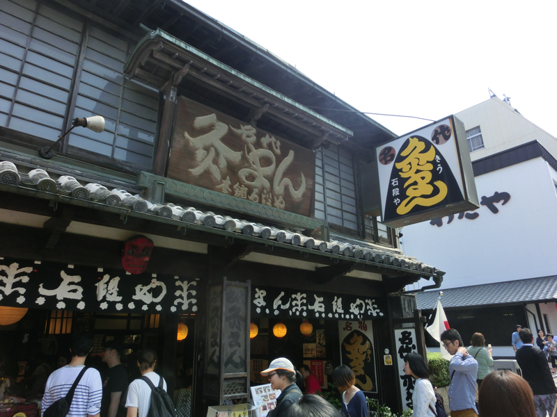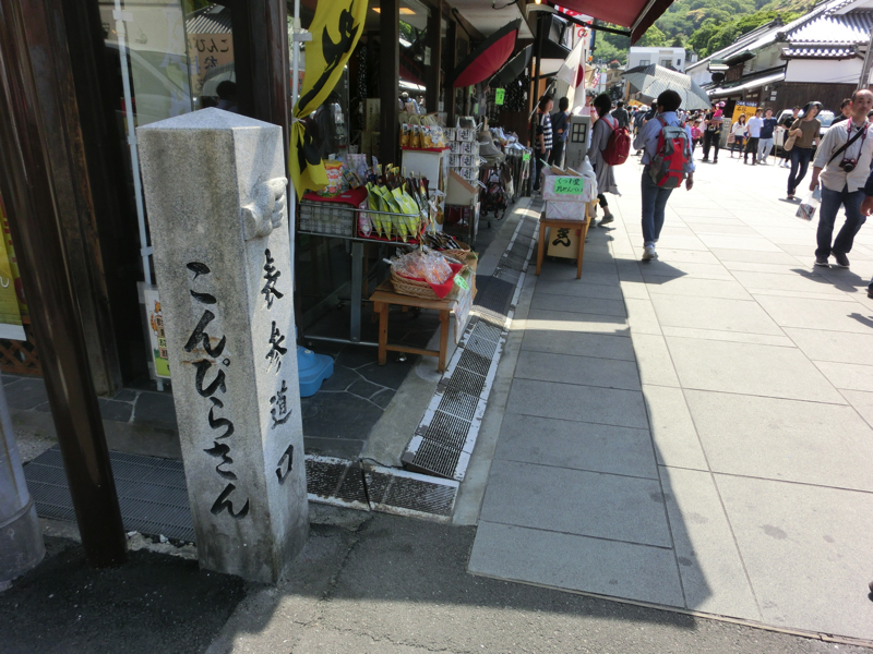 金比羅さんの参道入口から散策スタート。ゴールデンウィークなので、たくさんの人がいる。まずは腹ごしらえということで、こんぴらうどんへ行こう。少し行列ができているが、うどんなので回転は早そうだ。15分ほどで中に入り、ここはぶっかけで。エビとちくわのてんぷらをONして、だし醤油をかけていただきましょう。歯ごたえしっかりの讃岐うどんはやっぱりおいしいな。