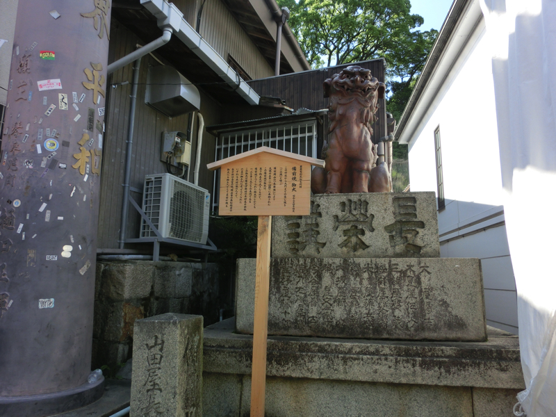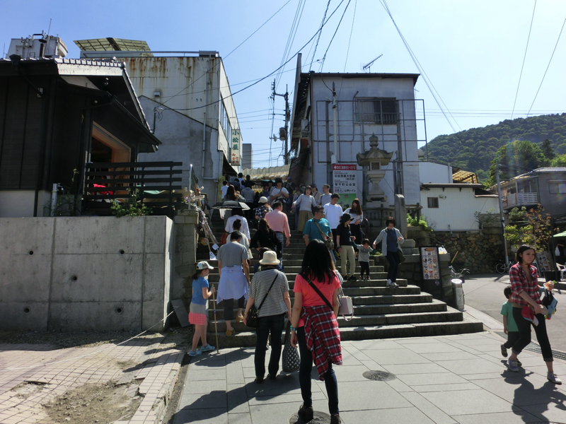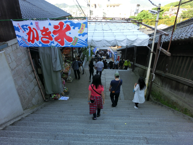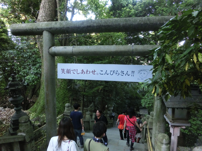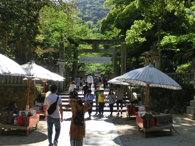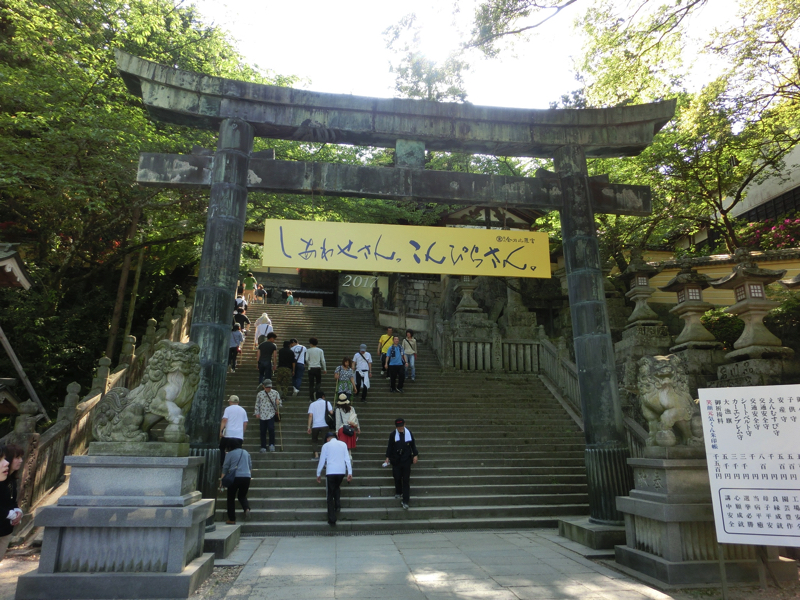 ではいよいよ参拝へ。ここからは785段の石段を登っていくのだ。しばらくは両側にお土産やさんが並んでいる。100段目を超える頃、一之坂鳥居に到着。この鳥居の傍らには備前焼の狛犬があり、これは重要有形民俗文化財とのこと。ここからは少し石段が急になり、一ノ坂と呼ばれている。