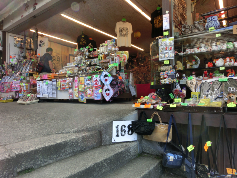 288段目。右側に銅像があるぞ。これは琴陵宥常という金比羅さんの宮司さんで、水難救助に尽力した方のようです。お土産やさんにはいろんな招き猫がいて楽しいな。