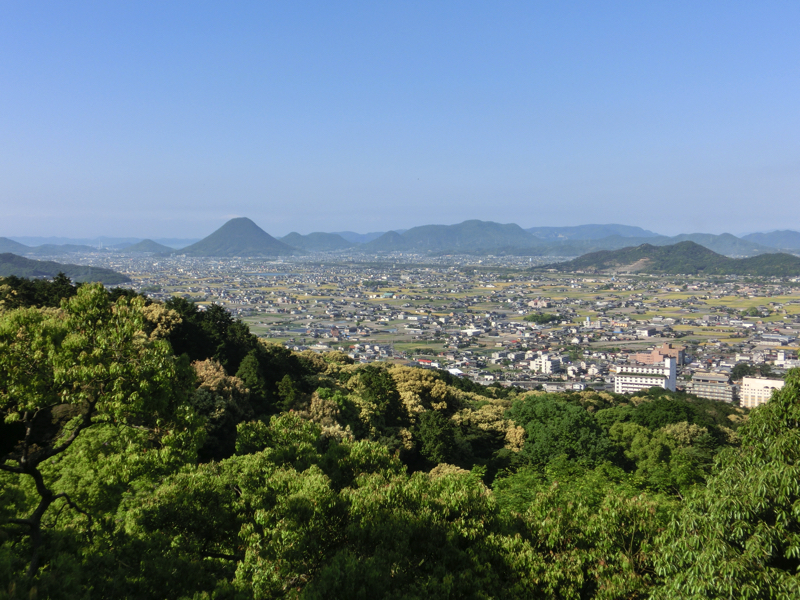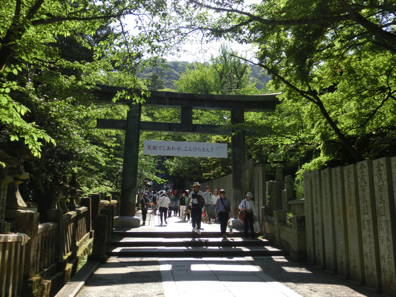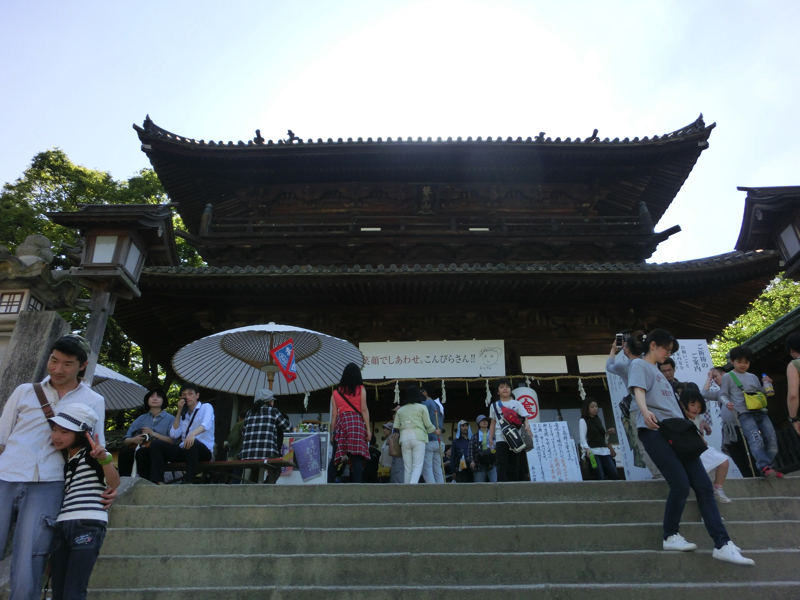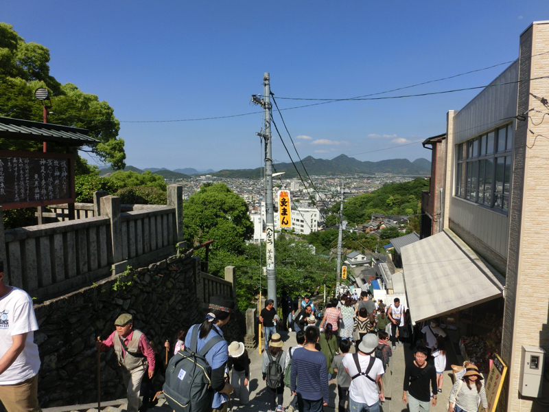 真須賀神社を過ぎ、いよいよ最後の石段。ちょうど光の加減で鳥居の向こうから光の道ができているようだ。さあ登ろう。一段一段踏みしめながら登り、途中の踊り場で一息つきながら、ようやく御本宮に到着。785段(正確には上り786段と下り1段)の石段を登ってきたぞ。とにかくまずはお参りだ。健康第一とあとはいろいろお願いし、これでOK。お参りを終え、展望台になっているところから讃岐平野を見渡す。讃岐富士はもちろん、遠くに瀬戸大橋を望むことができる。