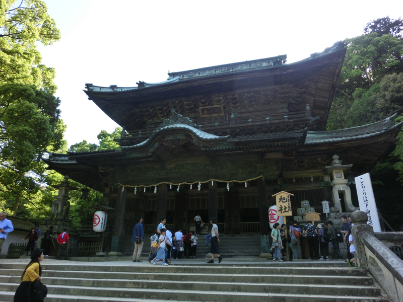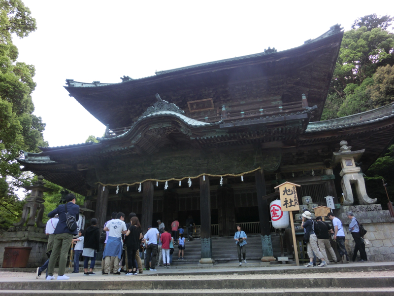 どんどん登ろう。石段の左側には山が広がって見えるので、紅葉の時期もまた綺麗だろうな。石段の登ると大きな社に着いたが、ここは旭社。御本宮はまだ先にあり、旭社は帰路にお参りする場所とのこと。では先に進みますか。
