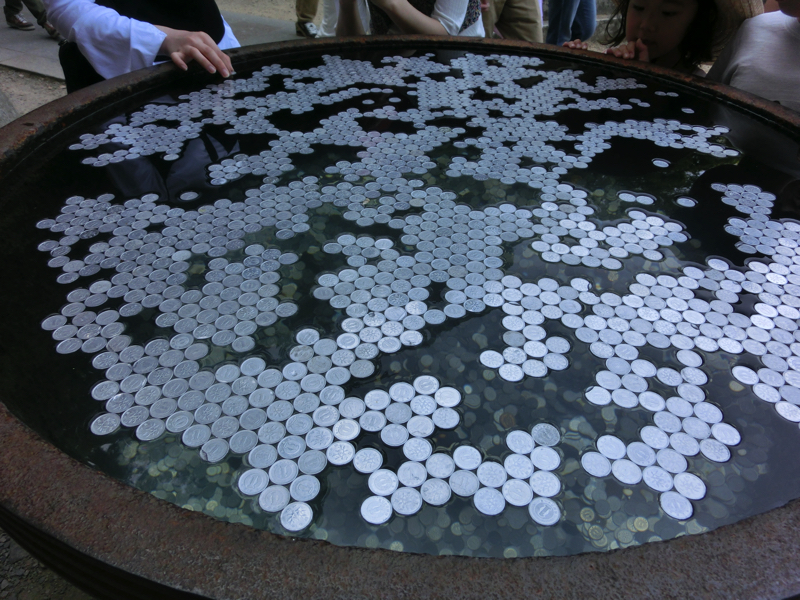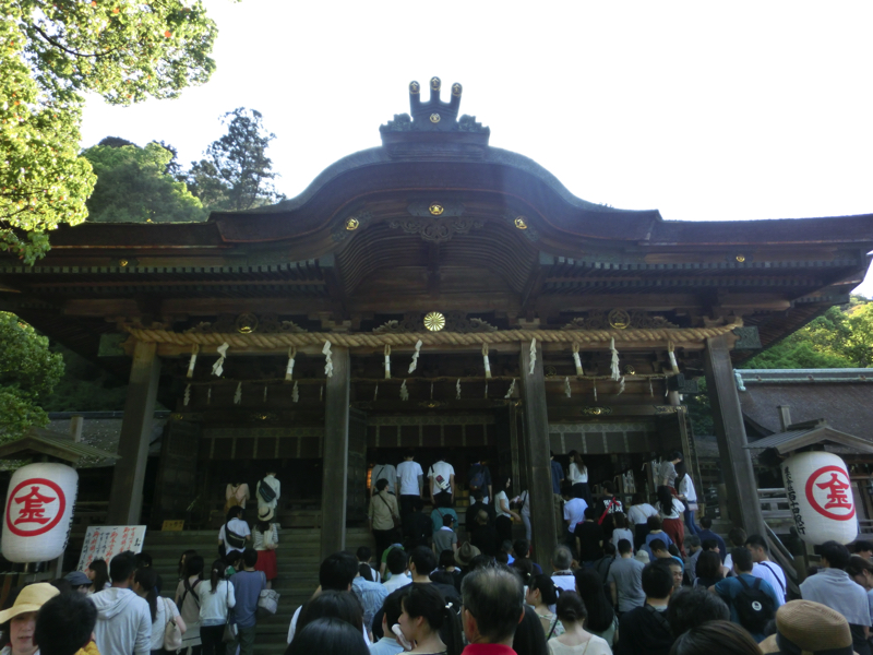 御本宮のまわりをうろうろ散策。まず目につくのは、本宮のすぐ左にある大木。これは神木のクスノキで、幹の周りは4.7メートル、高さは25メートルあるらしい。本宮から伸びる長い廊下は、隣の三穂津姫社まで繋がっているとのこと。少し歩くと馬の銅像があるが、これは一文銭を集めて作られたと伝えられているらしい。いろいろと歴史や謂れのあるものが多く、興味深いです。