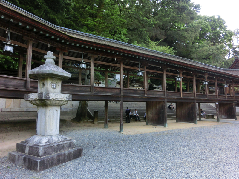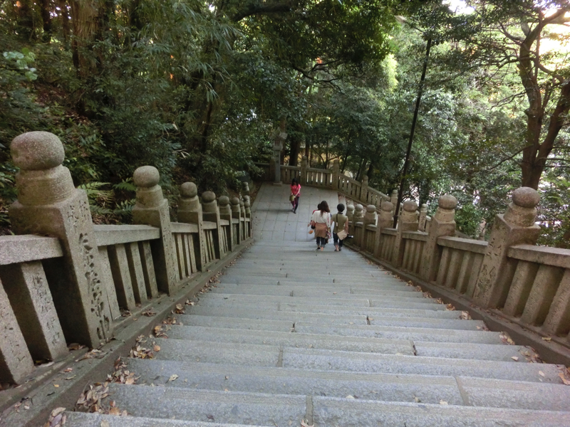 旭社を左に見ながら、鳥居をくぐるとその先に賢木門。檜皮葺の優雅な門だ。ここで653段、もう少しだな。しばらく歩くと、表参道から御本宮までの間で唯一下がる石段が。上がる石段が全部で786段なので、「な・や・む」の語呂を嫌って一段下げて785段にしたとか、諸説あり。ということで、ここで652段、あと133段。