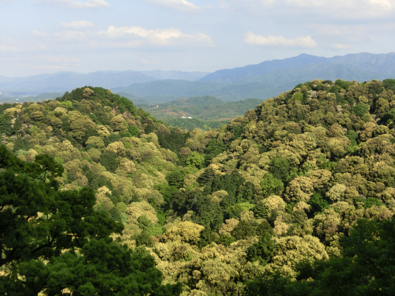 広く景色の見える場所があったので、しばし休憩。近くの山の緑が見えるが、いろんな緑があるね。木の種類が違うのか成長が違うのか、緑が綺麗だな。これが秋になると赤や黄色になるのかな。またそんな時期にも来れるといいな。では行きますか。帰路になる下向道をおりていく。