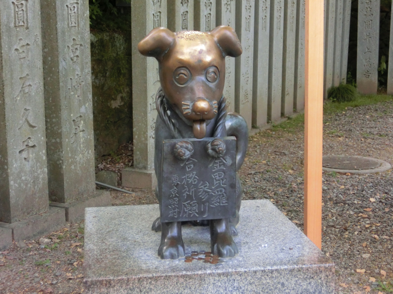 石段を下りると、旭社に到着。ここでお参りして、金比羅さん巡りはひとまず終了。あとは来た道をおりていくんだね。桜馬場西詰鳥居の脇には犬の銅像がある。これは「こんぴら狗」をイメージしたもので、かつてここまでお参りに来れなかった人が犬に代参を託したこともあったらしい。