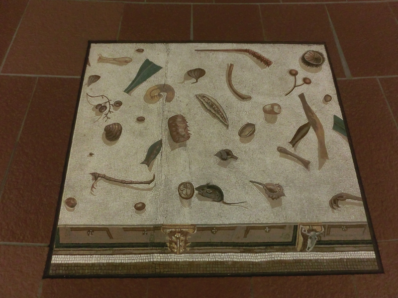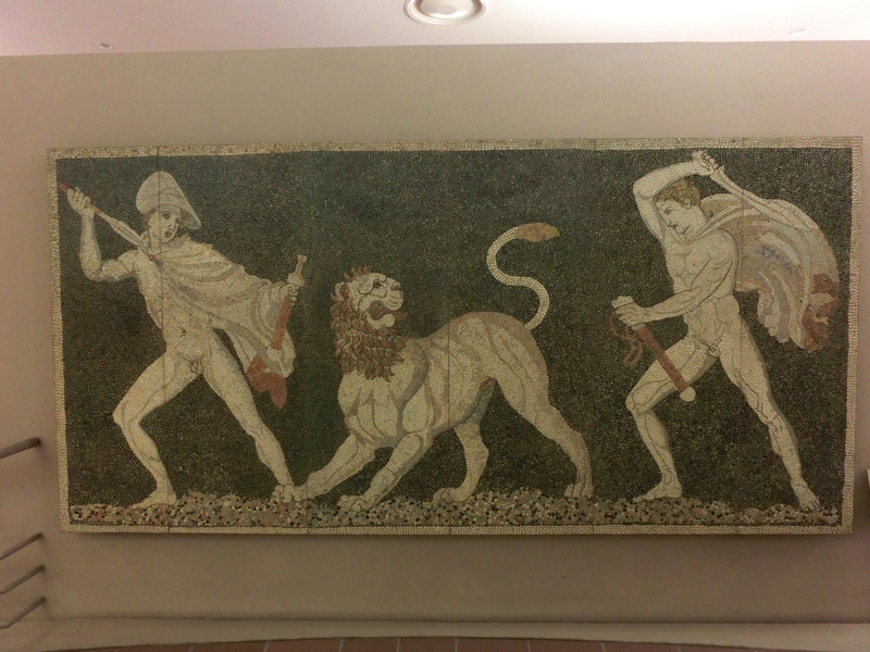 さて、次は円形のギャラリー。ここにはギリシアの壺絵、ポンペイの壁画、モザイク画など、古代の作品が系統別の約130点も展示されている。バチカン美術家やルーブル美術館などにある作品も多く、どこかで目にしているかもしれないな。でももっとも多いのは、ナポリ国立考古学博物館所蔵の作品。ここは行ったことがないので、ポンペイに行く機会があればぜひ行ってみたいな。