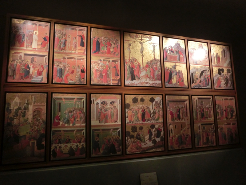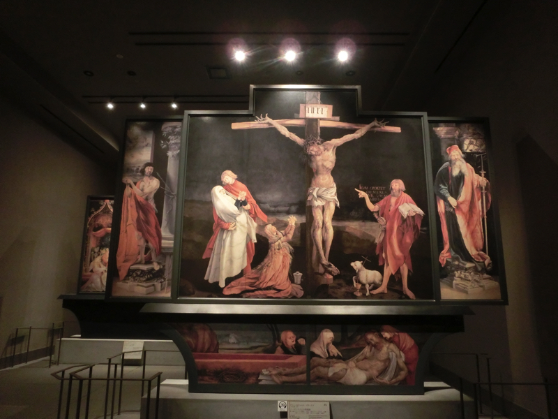 そして隣の部屋は「最後の晩餐」。壁一面に描かれており、向かい合わせで修復前と修復後。こんな風に見比べられるのも面白い。真ん中に椅子があってゆっくり見られる。これはミラノで見たのか。長年の旅の積み重ね、結構いろいろ見てるなあ。立派なキリストの祭壇画は、コルマールの美術館にあるとのこと。こんな大きなのがある美術館、コルマールのどこにあったのかなあ。