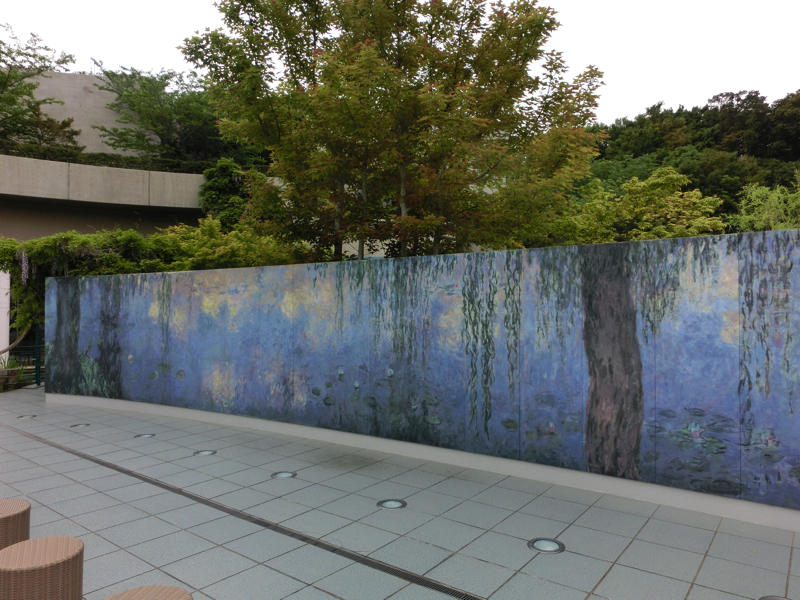 これでB3が終了。見応えがあるなあ。B2に上がり、そろそろお昼、まずは腹ごしらえ。モネの大睡蓮の前にあるのがCafe de Giverny、なるほど。ここでお昼をいただきましょう。阿波尾鷄のチキンカツ丼と、ヴィーナスカレーとやらにしましょうか。こういう場所にしてはしっかりボリュームがあり、悪くない。ごちそうさまでした。食後には目の前の大睡蓮を見る。かつてオランジュリーで見たのを思い出すなあ。あれは館内だが、こうして屋外で見る睡蓮もなんだか新鮮だ。ちょうど藤も満開だし、いい感じ。