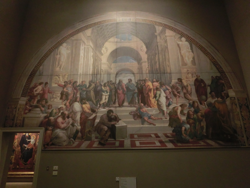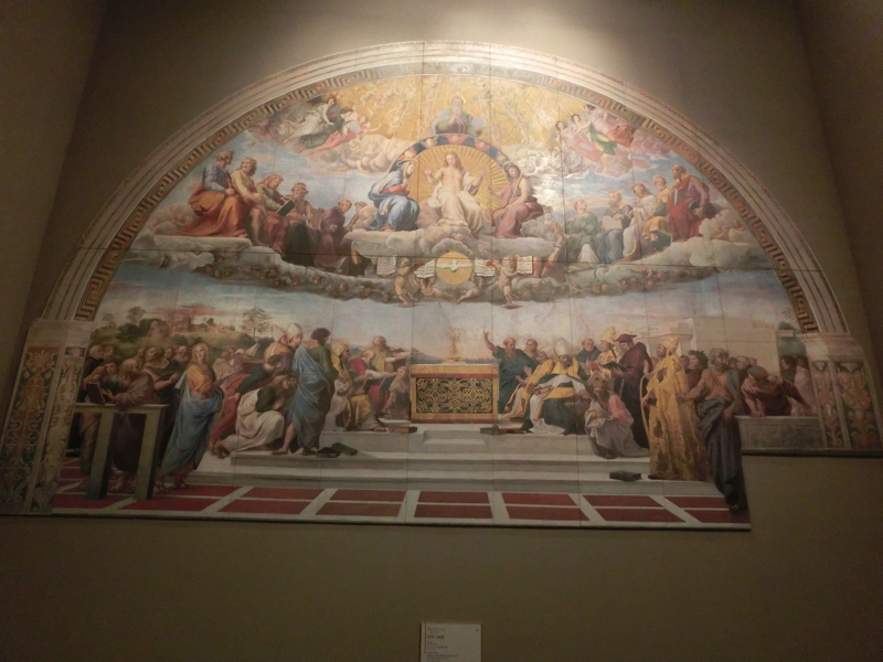 では再開。B2は時代が進み、ルネサンスが140点ほど。まずは「受胎告知」、ダヴィンチやボッティチェリなど、たくさんの受胎告知を並べて見られる。これは壮観だ。こんな見方はここならではだね。ラファエロの「アテネの学堂」「聖体の論議」これはヴァチカンで見たなあ。これほど迫力のある絵を間近で見られるのは素晴らしい。