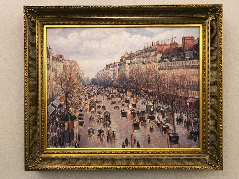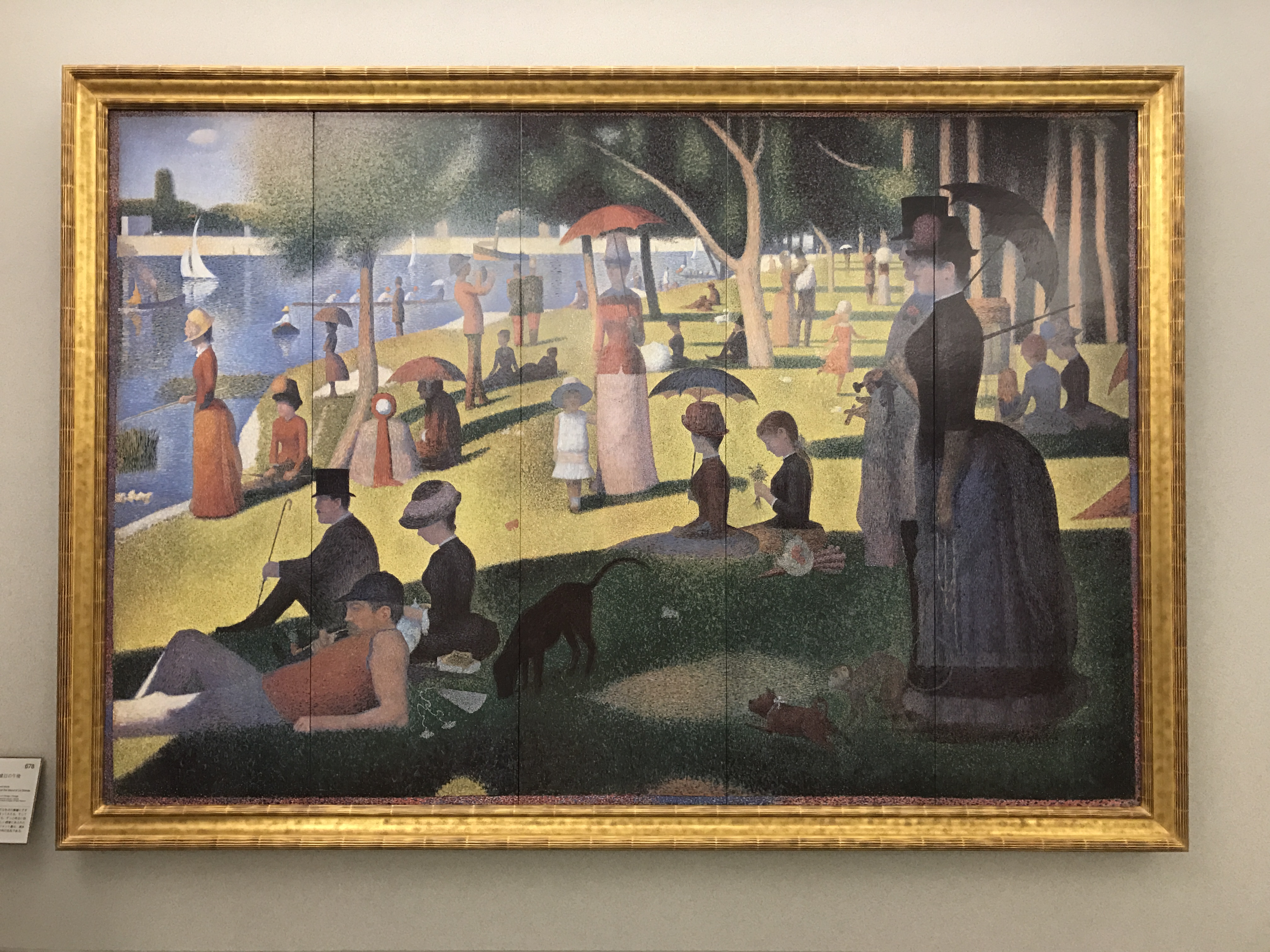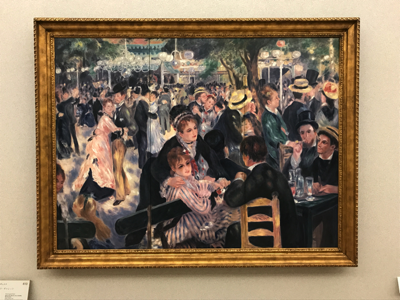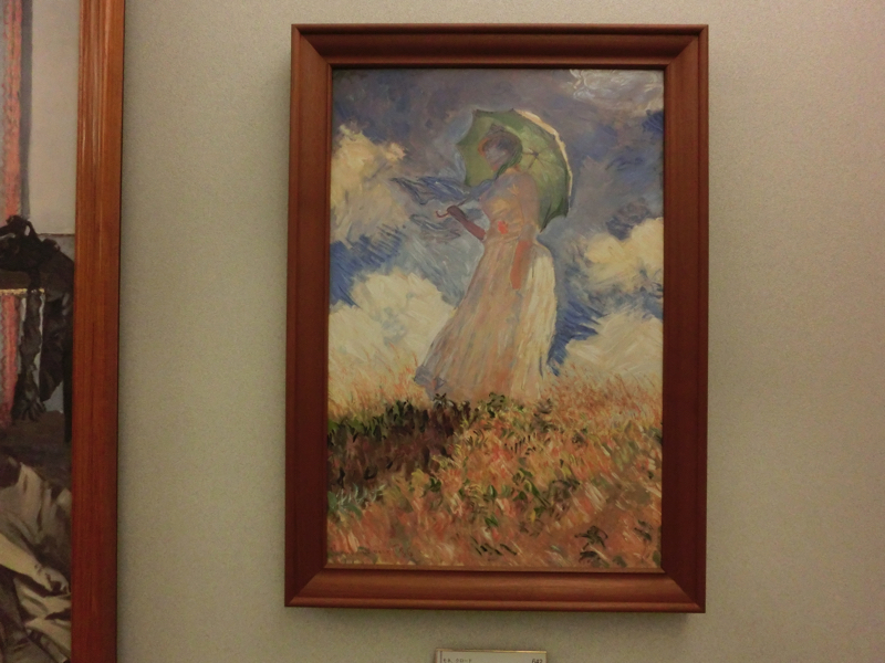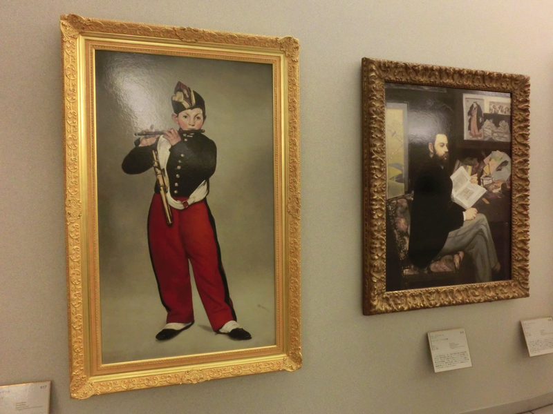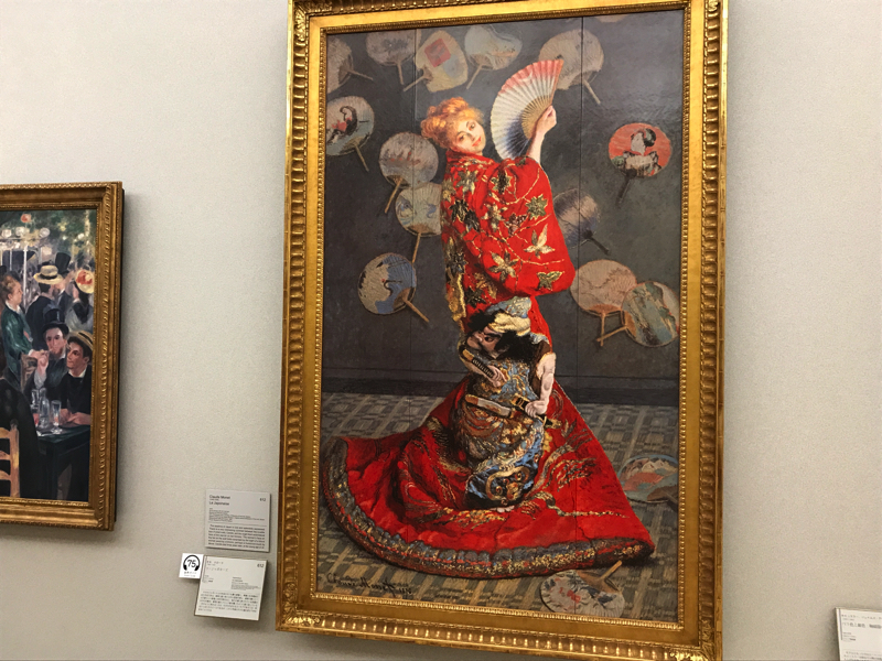 少し系統が変わり、ミレーの「落ち穂拾い」。これはバルビゾン派といい、フォンテーヌブローの外れのバルビゾン村に多くが画家いたらしい。これはオルセーで見たね。新印象派のスーラ「グランドジャット島の日曜日の午後」、よく見る作品だが、点描画なんだね。穏やかなパリの昼下がりという感じだ。そして再び印象派、日本をイメージしたモネのラ・ジャポネーズ。日本の文化がブームになった時代の作品だ。ちょっと派手すぎるとも思うが、華やかで綺麗だね。