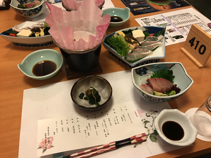 部屋に戻り少し休憩。そろそろ19時になり、ごはんへと行きますか。一階のレストランに行くと、もう準備ができていました。さてさて、まずは徳島の地酒でもいただきますか。まずは小鉢の山菜を味わいつつ、お刺身の桜鯛をいただく。そして鍋は、桜鯛とワカメのしゃぶしゃぶ。これが一番楽しみだったかも。昆布だしがほのかに感じるなか、表面が少し白くなるくらいにしゃぶしゃぶするとこれが美味。日本酒も合うしね。ワカメもきれいな緑色になり、歯ごたえもシャキッとしていておいしい。タケノコやフキなど、季節を感じられるのがいいな。続いては桜鯛のにぎり。吉野酢がかかっていて、ほんのりした酸味とともに美味しいです。