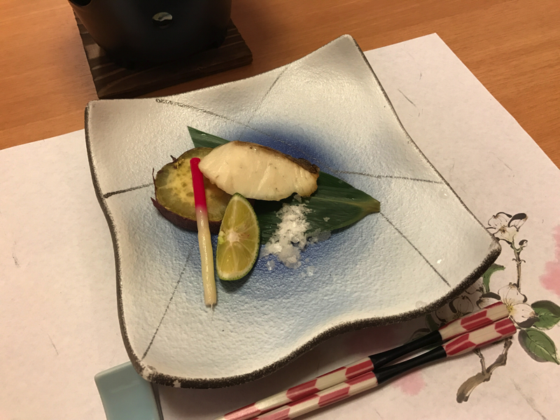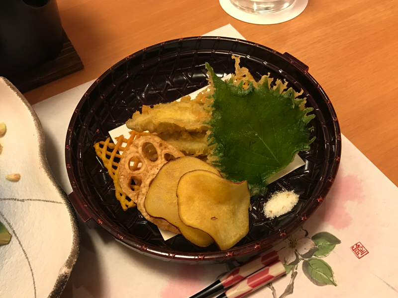 ここは料理がゆっくり運ばれてくるのがいいな。ホテルによっては、次から次へと出てきて慌ただしいところもあるからね。お椀はハマグリと菜の花、これも季節の一品。焼き物は桜鯛の塩焼き。これにすだちをかけ、付け合せに金時芋。まさに徳島づくしですね。揚げ物は若鮎のてんぷら、これも楽しみのひとつ、ほろ苦い味わいが実にいい。あと野菜シートという格子状のパリッとしたものがあるのだが、これも金時芋かな。料理の合間にこうした食感も楽しいです。