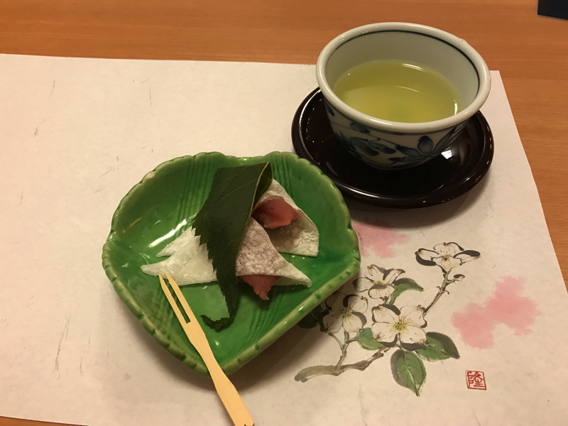 お酒がなくなった。次は鯛のあら煮なので、ここはしっかり鳴門金時の芋焼酎で行こう。ロックと注文したのに水割りが来たのかと思う量だが、ロックでした。さあて、あら煮だな。これは戦い甲斐があるぞ。濃いめの味付けに負けない鯛の身、これを芋焼酎とともにじっくり味わう。いろんなところに身が付いているので食べ応えは十分。たっぷりあったお酒もいい感じになくなっていくぞ。締めのごはんは鯛の釜飯。おこげのところが香ばしいし、鯛の身をしっかり混ぜて食べるといい風味だし、おいしいねえ。デザートには桜餅、ちょっと想像と違うのが出てきたがもちっとした食感が美味でした。