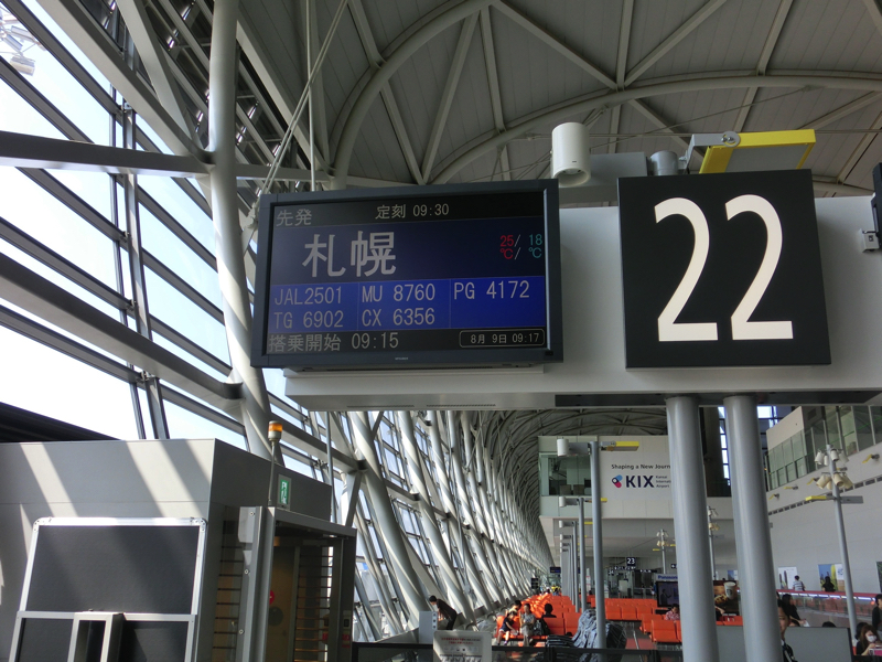 今年の夏休みは、北海道へ行こう。とにかく涼しいところに行きたいのだ。お盆の少し前だが、関空は賑わっていて夏休みモード。日本に来る人も多いしね。朝ごはんがまだなので、空港のコンビニで適当に買ったらちょうど1000円。これは縁起がいいのかな?ただ、大阪はこんなにいい天気だが北海道は台風の影響で予報ではずっと雨模様。少しでも天気がいいといいのだが・・・札幌に向けて離陸した飛行機だが、なんだが爆睡。ドリンクサービスだけはなんとかいただいたが、すぐに爆睡。なんでこんなに眠いんだ?ということで、あっという間に新千歳国際空港に到着だ。