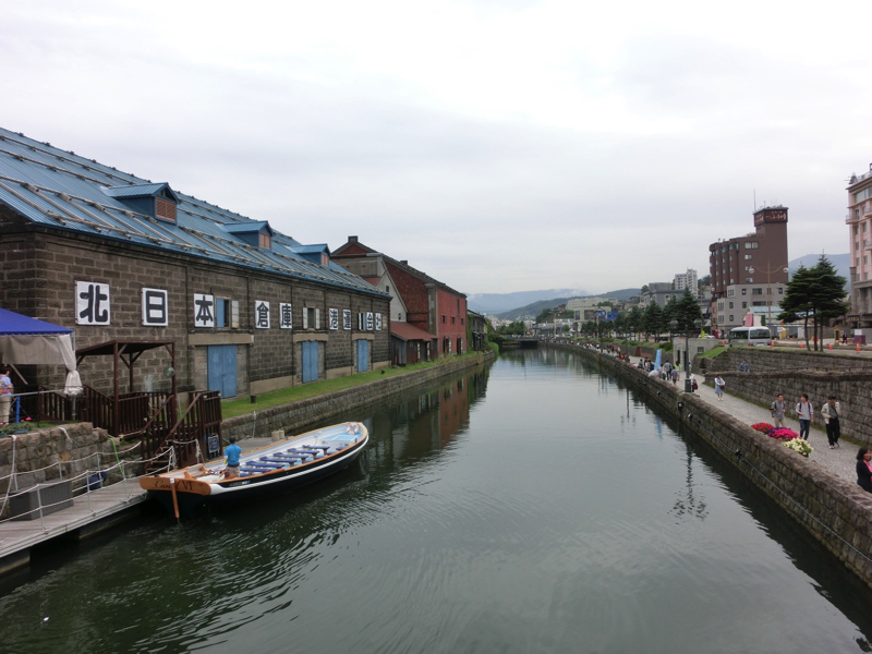 空港からはエアポート特急に乗る。いつもは札幌行きでいいが、今日は小樽まで行くのに乗って一気に行こう。雪まつりの時以来なので、7年ぶりの小樽だ。駅に着くと、涼しい。大阪では少し歩くと汗だくになるのに、ここは涼しくて気持ちいい。天気もなんとか降らずに持ちそうだし、これだけでも北海道に来た価値があるというもの。駅から運河まで歩き、運河沿いのホテルソニアに入る。まだチェックイン前なので、荷物を預かってもらい町歩きへと行きましょう。