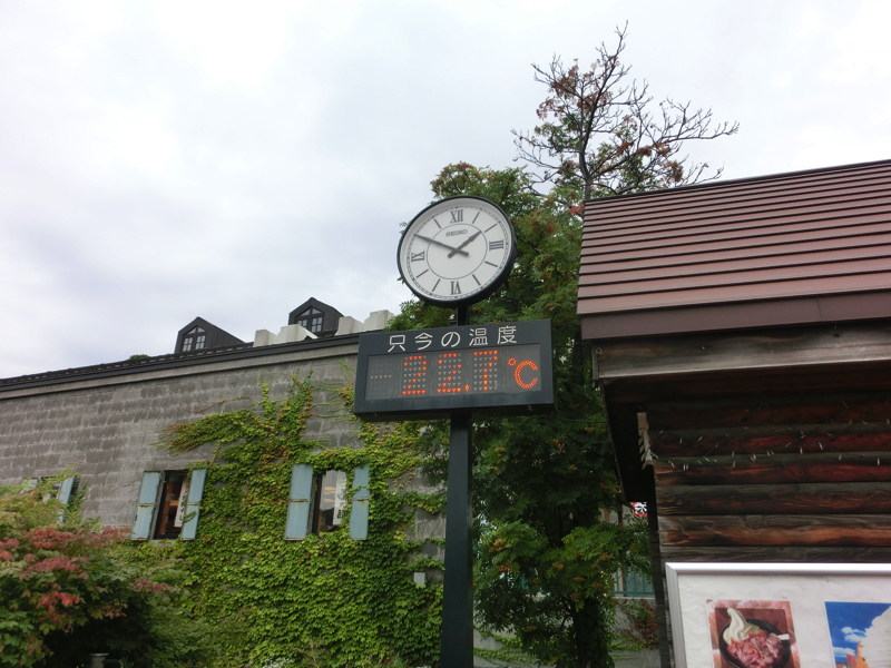 まずはお昼ごはんかな。目指すは前も来た回転寿し、和楽だ。運河沿いをずっと歩いて行くと、がら空きのすしざんまいがあり、その向こうにあるのが和楽。入ると並んでいる人がいて、どうやら1時間以上待ちそうな感じ。少しお昼時は過ぎているが、人気店なんだな。せっかくなので待ちましょう。とはいえここにいても仕方ないので、しばらく運河沿いを散策しますか。まずは牛乳ソフトクリームをいただきましょう。山中牧場というところのらしく、牛乳風味がしっかりと感じられるおいしいソフトクリームでした。運河沿いを歩き、小樽らしい場所で写真を撮ろう。この前は雪の中だったが、この夏の景色もいい感じだ。それにしても、気温22.7度は実に快適だ。