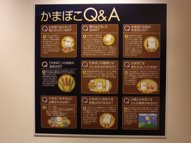 そろそろ時間かな。和楽に行くと、まだあと30分位かかりそうかな。さらに先まで歩くと、かま栄というかまぼこやさんが。工場見学もあるらしいので入ってみよう。残念ながら今日工場は動いていないらしく見学はできないが、かまぼこに関するビデオを見たり商品を見たり、どれもおいしそうだ。さすがに今は買えないが、千歳にもあるらしいので帰りに空港で買えたらいいな。