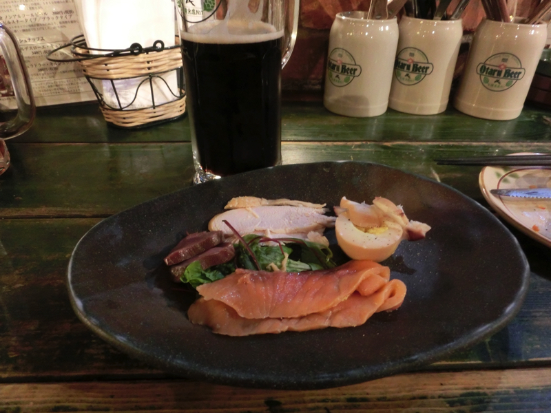 いつの間にか寝ていた。ベッドが適度に硬くて気持ちがいい・・では出かけますか。小樽の屋台村があるとのことなので、行ってみよう。駅と運河の間くらいにある商店街の中にその屋台村はあったが・・イマイチ。お盆だからか、半分くらいのお店が閉まっている。開いているお店はそれなりに賑わっているが、あまりピンとこない感じ。ここはやめておきましょう。運河に戻りつつ、途中にあった地ワインのお店に入ってみる。すると、ここはカフェでもう食事はオーダーストップ。だめじゃん。ということで運河沿いのお店に行きましょうか。小樽倉庫No.1というお店に行ってみる。かなり賑わっているようだが、カウンターのような席に無事着くことができました。この賑わっている人たちは、ビール工場見学や飲み放題も含めたイベントのようでした。そうではない一般のひとたちもいるので、我々はそちら側。まずは小樽ビールのピルスナーとヴァイスで乾杯だ。すっきりしたピルスナーとフルーティなヴァイス、どちらも地ビールらしい味わいでおいしい。