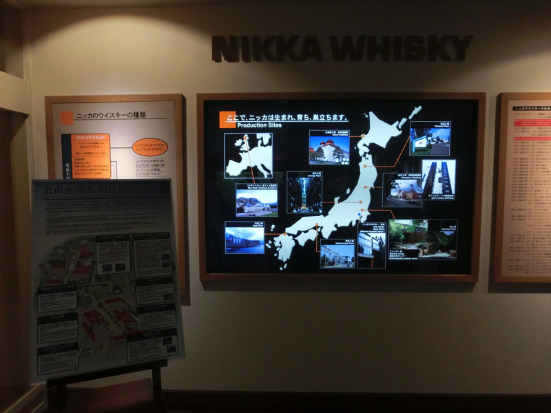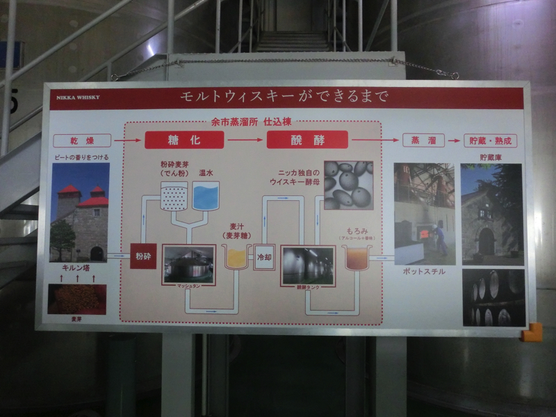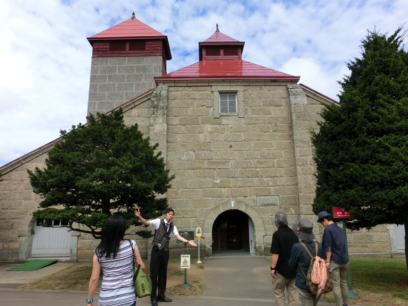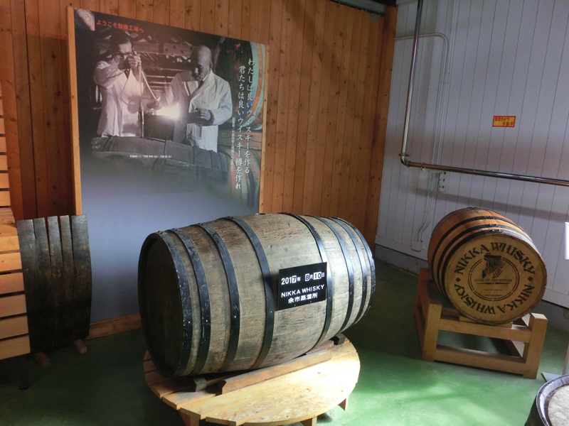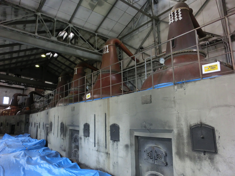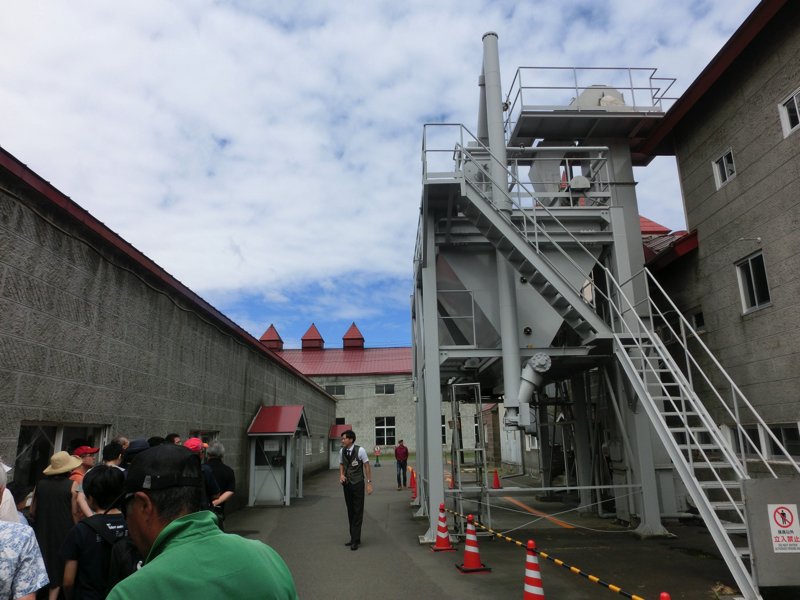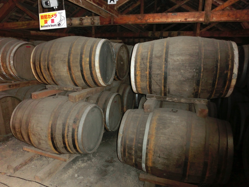 続いて蒸溜棟へ。ここでは石炭を使って蒸溜しているらしく、世界でもここだけとのこと。巨大な蒸溜管にしめ縄が設えられているところが日本らしい。その先にあるのが、ニッカウイスキー創業当時の事務所。当時は大日本果汁株式会社という社名で、そこからニッカとなったようだ。その横にあるのが醗酵棟、順序的には蒸溜より前の段階だね。ここで大麦からできた麦汁とウイスキー酵母を合わせ、醗酵したのがもろみ。それがさっきの蒸溜塔でウイスキーになるんだな。