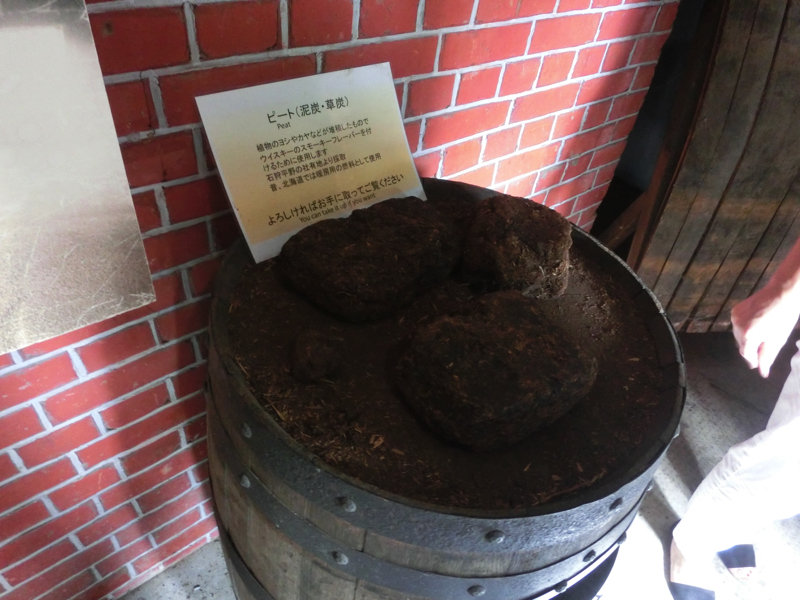 ツアー開始まで、しばらくは待合室で事前の情報収集。日本のウイスキーは最近評価が高いようだが、マッサンこと竹鶴政孝氏の夢とそれを支えたリタの努力がこうして身を結んでいるということ。すばらしいですね。確かにこれは朝ドラになるなあ。さて、時間になり見学ツアーがスタート。若いお兄さんによる説明が始まり、まずはキルン塔と呼ばれる乾燥棟へ。大麦を乾燥させる時に使用されるピートという泥炭がこのあたりでは大量に取れるらしい。泥の塊のようだが、触ってみると意外に軽い。