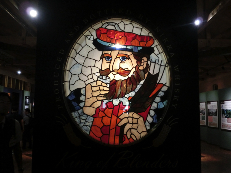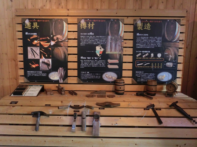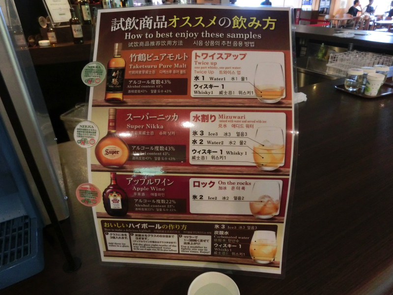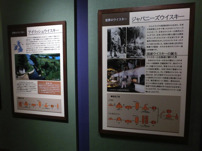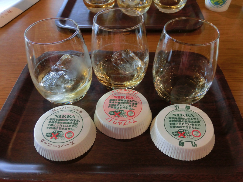 ウイスキー博物館に入る。ここはたくさんの展示があり、見学ツアーではざっと見て回るくらいなので、あとでまたゆっくり見に来よう。さて、いよいよ試飲タイム。試飲会場に入ると、まず3種類のグラスをいただく。竹鶴ピュアモルト・スーパーニッカ・アップルワインがそれぞれ少しずつ入っている。まずはそのまま味わってみて、続いてはそれぞれのお勧めの飲み方で。ピュアモルトは水を同量のトワイスアップ、スーパーニッカは倍量の水と氷の水割り、アップルワインはロックで。正直なところウイスキーはあまり得意ではないのでどちらがいいのかはよくわからないのだが、アップルワインは飲みやすくておいしい。でもこうして比べて飲めるのは面白いな。