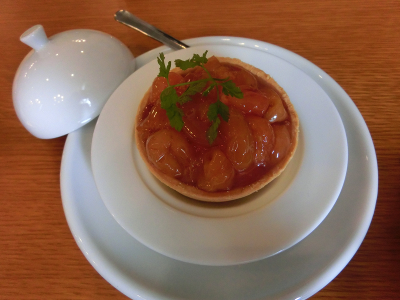 ごちそうさまでした。隣のお土産やさんに行ってみる。ウイスキーは買わないが、ウイスキーを使ったキャラメルやチョコ、アップルワインを使ったパウンドケーキなどが美味しそうなので買ってみよう。そろそろお昼時。ウイスキーを飲んだので、しっかりした味のものを食べたい気分。すぐそばにレストランがあるので、ここでカレーそばを頂く。ウイスキーの入った体にちょうどいい感じでした。デザートに、この近くにある仁木町のさくらんぼを使ったタルトをいただこう。日本のさくらんぼという感じで、あっさりとした甘さのおいしいタルトでした。