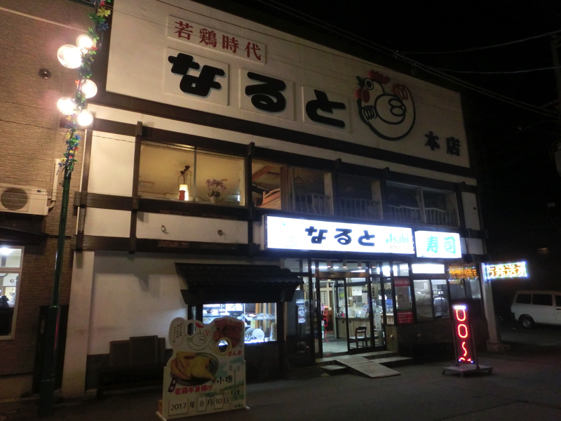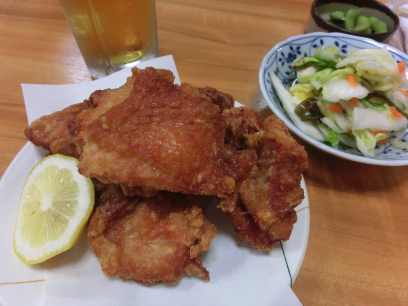 気持ちのいいベットで少し寝てすっきり。18時半ごろ、そろそろ出かけますか。明日はしっかり海鮮をいただくので、今日はビールとザンギなんてどうかな。ということで、小樽駅そばの市場近くにある「なると」というお店へ。有名店らしく、ほぼ満席の状態だがちょうどいい感じでテーブルが空いていました。ここは前払いシステムとのことで、レジで生ビールとザンギ、鳥の半身揚げにサラダと浅漬け盛り合わせと行ったところかな。まずはビールで乾杯、生がうまい。そしてすぐに、ザンギ到着。大きめの唐揚げは揚げたてでジューシーでおいしい。ビールがよく合います。続いて出てきた半身揚げ、これも揚げたて。ムネ肉とモモ肉の両方味わえるし、皮の香ばしさも身のジューシーさも両方味わえるしでいいなあ。アバラの周りも細かい身がついていてこれも残さず食べよう。しっかり鶏肉が味わえて、満足です。ただ、サラダはドレッシング多すぎ・・・なんでかな?