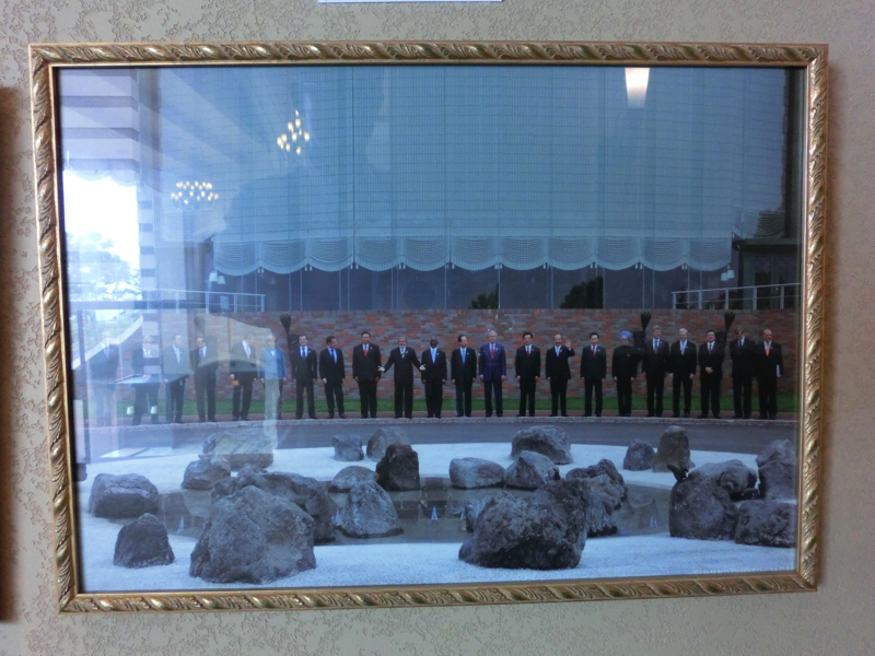 食後はホテル内をうろうろ。ロビーの片隅に、サミット関係の写真や新聞などが展示されている。このホールの前で、各国首脳が並んで記念写真を撮ったんだね。洞爺湖サミットは2008年は福田首相、ずいぶん昔の出来事に感じるが、このころからメルケルさんはいるのね。サミットで使用された食器が展示されていたが、何を食べたのかな。過去のサミットの写真もあったが、3回の東京サミットは大平首相、中曽根首相、宮澤首相、そして九州沖縄サミットは森首相。全部記憶にあるなあ。あとはお土産やさんを見たり、ロビーでのんびりしたり。どっちにしても、外の景色は見えません・・