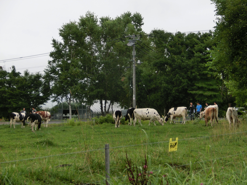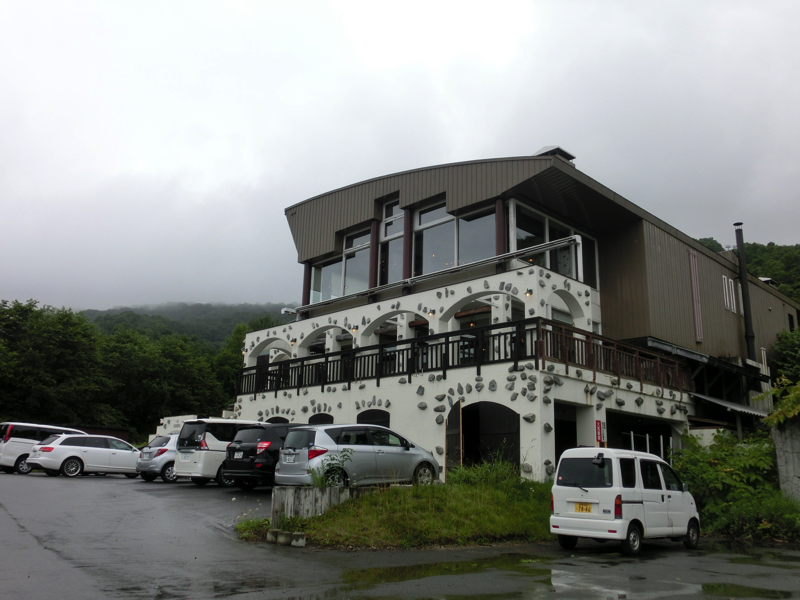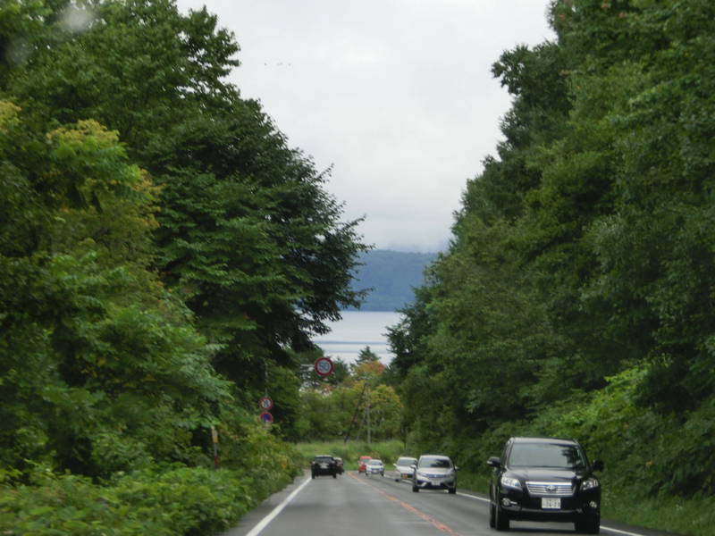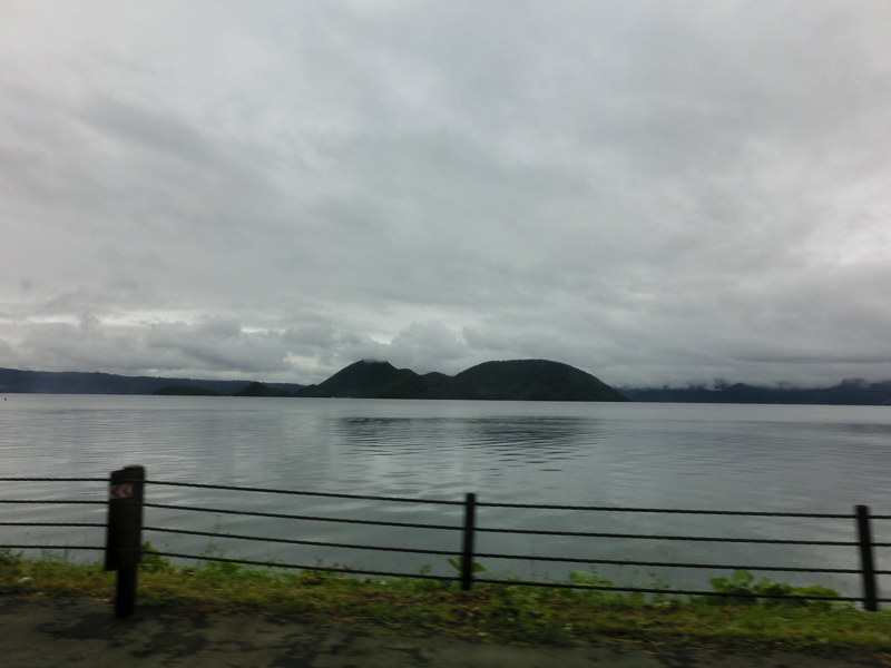 お昼を過ぎ、そろそろ行きますか。地下駐車場から乗れるので雨には濡れないが、ホテルのすぐ近くからでもホテル全景が霞んで見える。まあ、これも風流よの。ゆったり過ごせたので良かったです。では出発。丘をずっと降りていくと、降り切ったところに牛が。なんだ、と思ったらここは牧場だそうで。晴れていればこんなところも楽しそうだな。途中、昨日の夜に行ったイタリアンレストランを明るいところで見ておこう。このあたりは霞んでいないので、走りながら洞爺湖が見える。中の島も見えるし、湖畔のホテルも良さそうだな。洞爺湖を半周ほどしたあたりで湖に別れを告げ、目指すは支笏湖。