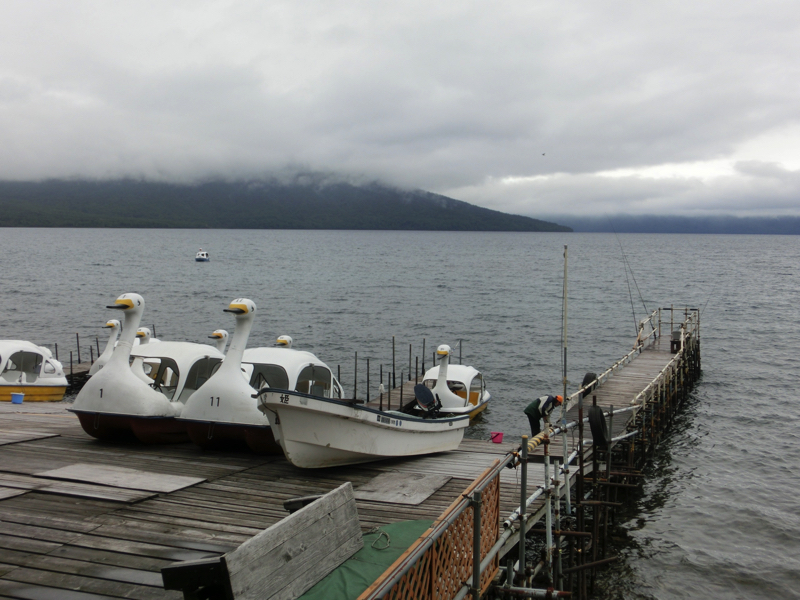 途中、かなりの山越えもあるが快調に走る。雨は降ったりやんだりだが、ほぼ上がったかな。支笏湖沿いの道に入ってきたが、すぐそばにあるはずの支笏湖が樹々にかくれてほとんど見えない。しばらく行くと、温泉街のようなところに出てきたぞ。このあたりで昼ごはんにしたいので駐車場に止める。ここは大きな駐車場があって、そこからは歩いて観光できるようだ。お店が並んでいる中を少し行くと、memereというお店が。ここで、スープカレーをいただくことにしよう。大きな鶏肉がしっかりと入ったスープカレーは、野菜もごろごろしておいしいです。北海道に来たら、一度は食べておかないと。食後は支笏湖畔まで行ってみる。少し気温が下がってきたのか、湖畔に下りるとかなり肌寒い。大阪では信じられない気温だ・・・さすがにスワンボートの利用も少ないようで。