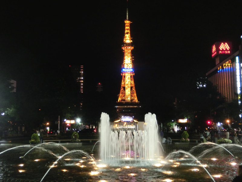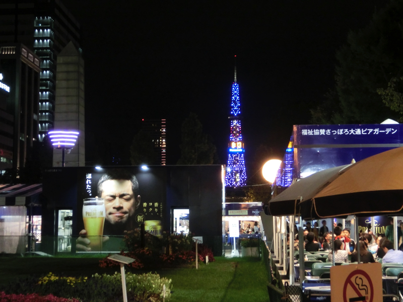 それにしても、涼しい。Tシャツ一枚でちょうど気持ちいい気候。札幌はいいなあ。ちょっと雨が降ってきたということで、地下に入れば大通りまでスムーズにいける。上に出ると、大通公園は夏のイベントとしてブロックごとにビアガーデンが並んでいる。各社あるが、やっぱりサッポロビールかな。小雨の中歩き、8丁目会場に到着。中は賑わっているが、席を見つけておねえさんにビールとおつまみをオーダー。まずはサッポロビールで乾杯だ。ドライブで少し疲れた体にぐっと染み渡る感じで、おいしいです。おつまみはソーセージとごぼうフライ、しっかりした食感のソーセージと少しスパイシーなごぼうフライ、どちらもビールに合いますね。お昼が遅かったのでこのくらいで十分だが、短い札幌の夏を楽しむビアガーデン、楽しいです。