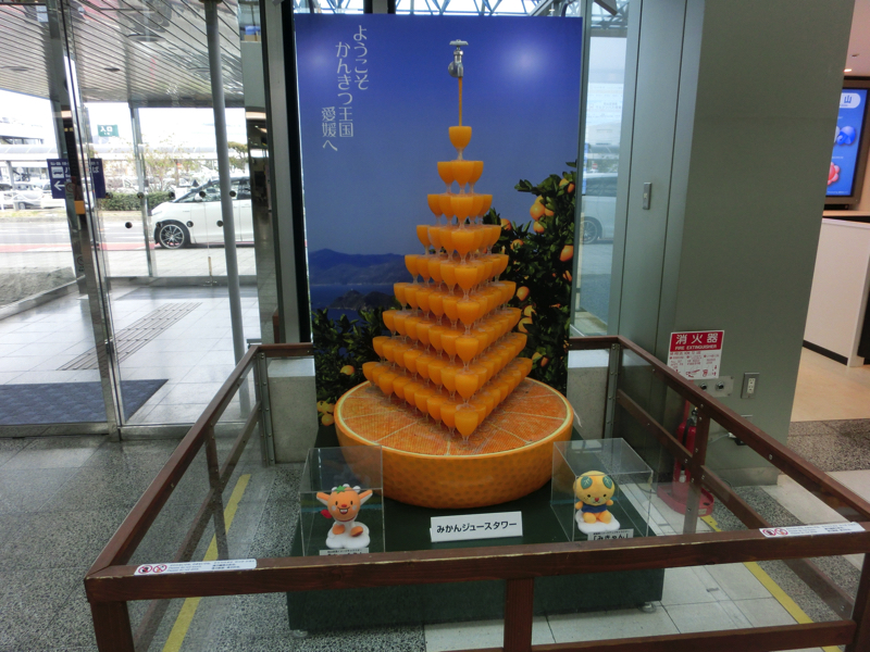 久しぶりの国内旅行。今回は、マイルで飛ぶ愛媛の旅。フライトが午後なので、ゆったり準備ができる。千里中央でラーメン食べて、伊丹空港へ。3連休ということもあり、空港は賑わっているな。どのフライトもほぼ満席のようだ。さあ、いよいよ出発。松山までは1時間もないフライト、近いものだ。着陸の手前では、瀬戸内の島々がたくさん見えている。無事に着陸し、荷物も到着。到着ロビーに出ると、愛媛らしくオレンジのタワーがありました。ここからはレンタカー、今回は地元のスカイパークというレンタカーで、やっぱり大手よりは随分と安い。もちろん車には何の問題もなく、出発だ。