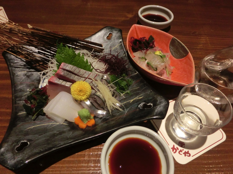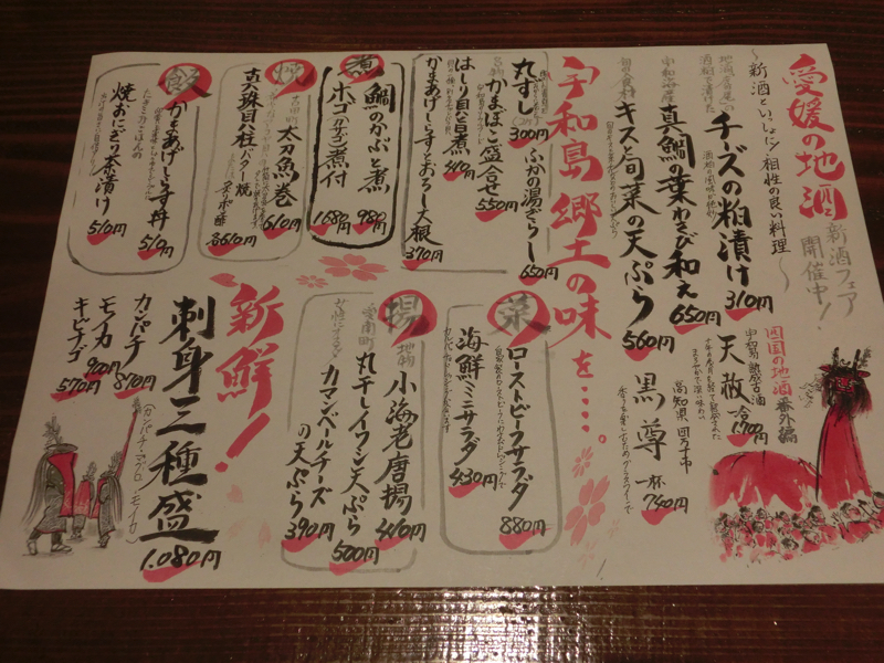 そろそろ19時。晩ごはんを予約済みなので、行きますか。ホテルを出て、少し歩いた大通り沿いにある「かどや」が今日の食事処。地元では有名なお店のようで、結構賑わっているし予約も入っているようだ。さて、何にしましょうか。せっかくなので宇和島らしいものをということで、いろいろと選んでみる。まずはお酒、内子町の「千代の亀」と八幡浜の「川亀」。どちらも亀がつくのはたまたまかな。どちらもフルーティで飲みやすいお酒。いいですね。料理の最初は「刺身三種盛」と「真鯛葉わさび和え」。刺身はカンパチ・キビナゴ・モイカで、どれも新鮮なプリプリしゃっきりねっとり。わさび風味の鯛もいかにも新鮮な味わい。お酒と合いますね。続いては「キス天ぷら」軽い衣をまとったキスに野菜、さっくりした歯ざわりが心地いい。次に来たのは「ふるさと小箱」どうやら宇和島地方の名物を少しずつ味わえるようで、じゃこ天と福めん、フカの湯晒し。じゃこ天はともかく、他は何?「福めん」とは、千切りにしたこんにゃくに、ネギと紅白のでんぶ、みかんの皮のみじん切りが覆い隠すようになっている。これをとにかくしっかり混ぜていただくようで、こんにゃくの歯ごたえにいろんな味が混じり合ってなかなかの美味。これはダイエット食かもね。「フカの湯晒し」はまるでクセのない白身を麦味噌で食べる。フカかなんだか、そのもの味はあまりなく、歯ごたえと麦味噌の味で刺身こんにゃくを食べているような感じ。一緒にきたのが「しらすおろし」、釜揚げのふわっとした身と大根おろしがおいしいなあ。もう少し何か食べよう。「丸干しイワシの天ぷら」これが・・絶品。これは今日イチの一品だな。そしてこれがメイン「ほご煮付け」。ほごとはカサゴのことのようで、それを濃いめの味付けでしっかり煮ている。新鮮な魚を煮付けで食べる贅沢、身がプリプリ感でとてもおいしいです。そろそろ締めかな。ここはやっぱり「釜揚げしらす丼」、南予らしく生卵の黄身が乗っている。ふわっとしたしらすに少しの醤油と卵を絡め、おいしくいただきました。ごちそうさまでした。