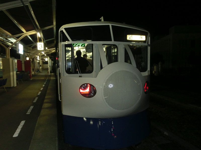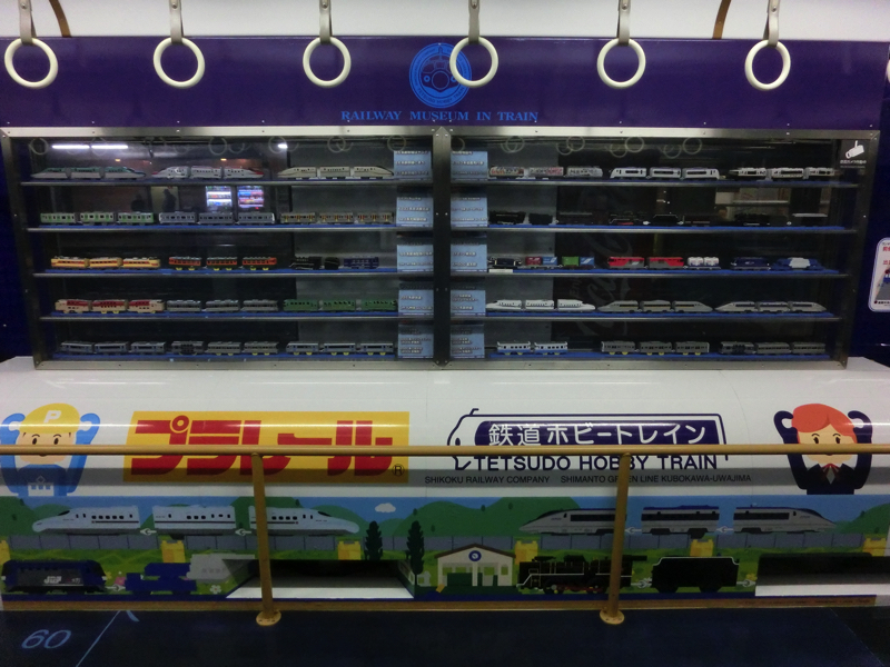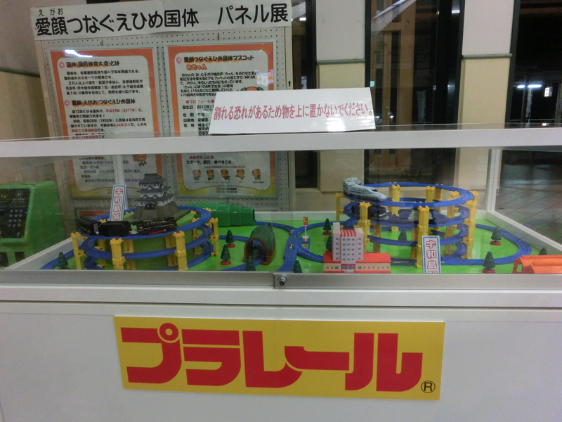行きますか。でもホテルに戻るとすぐに寝てしまいそうなので、少し散策。とはいえ空いている店もないので、宇和島駅まで行ってみましょうか。夕方のニュースで鉄道イベントをやっていた様子が映っていたので、なにか余韻が残ってないかな。駅のがらんとした待合室には宇和島城と宇和島駅をイメージしたプラレールがありました。時刻表を見てみると、1時間半後くらいにここを出発するのが「鉄道ホビートレイン」。これって・・あの0系新幹線デザインの電車のこと?そうか、たしか高知を走っていたかと思っていたがここ宇和島は予土線の終点、ここから出発するんだな。そうとなれば、待ちますか。きっと早めに来るでしょ。少し寒いのでホットレモンで暖をとりながら待っていると、出発時刻の30分ほど前になって到着しました。たしかにこれは懐かしの新幹線、0系だ。団子鼻もそうだし、中に入ると懐かしの座席、小さなテーブル。これは面白い。車内には新幹線やトワイライトエクスプレスなど、いろんな車両のプラレールが飾られている。別に鉄オタではないが、こういうのは楽しいですね。