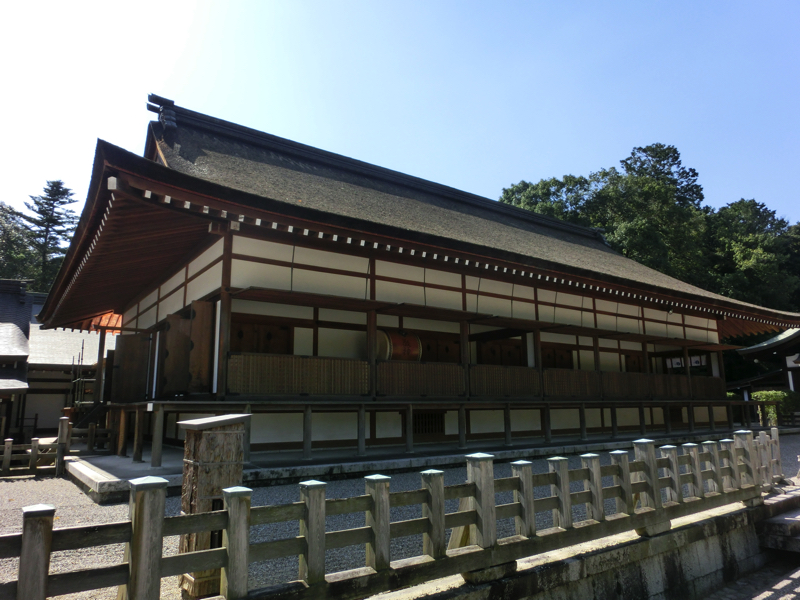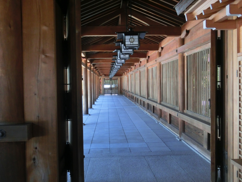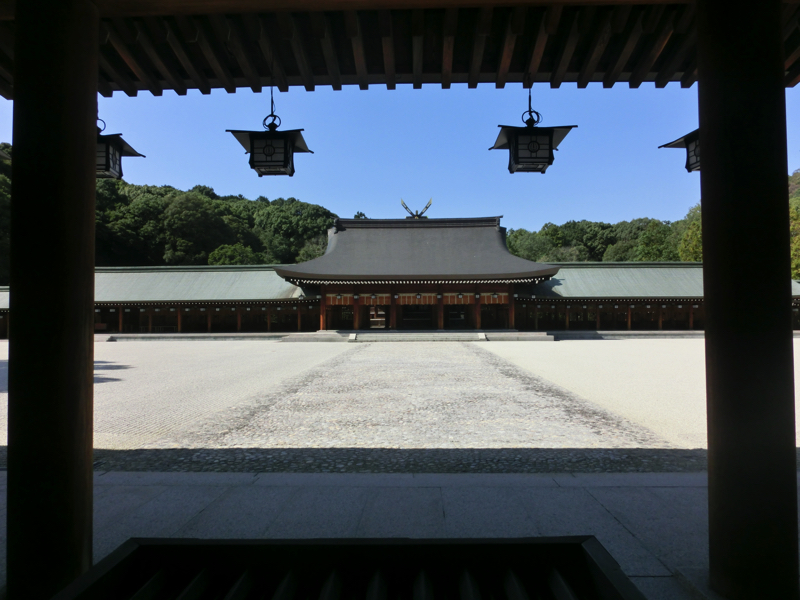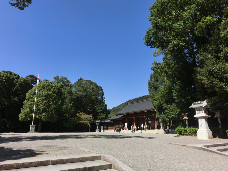 外拝殿から内拝殿には、左右に美しい回廊が続いている。一般参拝客は見るだけだが、お祓いとかお願いしたら中に入れるのかな。外からでも、しっかりとお参りしておきましょう。その後はこの広い神域内を散策。神楽殿の大きな太鼓を見たり、御朱印をいただいたりとゆったり過ごす。ここのおみくじは金鵄と鮎があり、どちらも神武天皇とのゆかりがあるようだ。こういう長い歴史を持つ国にいること、何か誇らしい。
