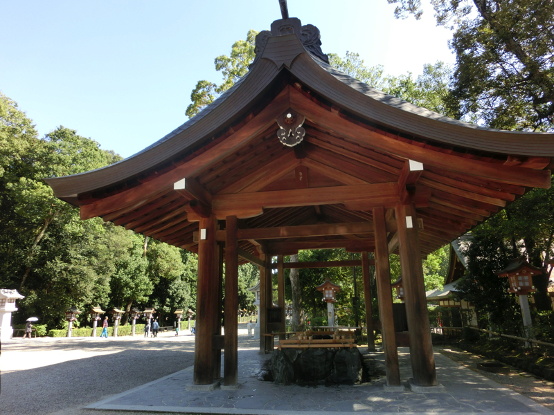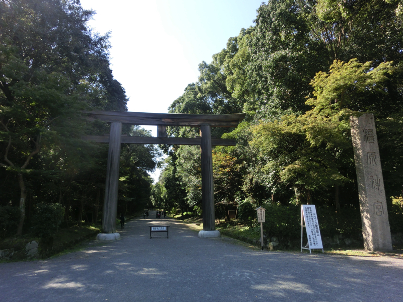 散策にいい季節になってきた。久しぶりのお出かけは、橿原神宮にしよう。奈良生まれでありながら、まだ行ったことがない場所。京都発橿原神宮前行き急行での認識しかなかった。天王寺乗り換えで近鉄阿倍野橋駅からは吉野行き急行で1時間ほど、その気になれば全然遠い場所ではないなあ。駅を出ると、きれいな青空が広がっている。人も多くないし、橿原神宮は小高い畝傍山の麓にあるので、緑に向かって歩いていく感じが心地よい。砂利道の表参道を抜けると南神門に到着、手水舎にて浄めましょう。大晦日などはここが人でいっぱいになるんだろうな。