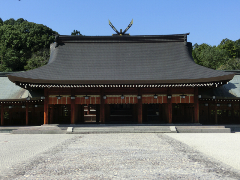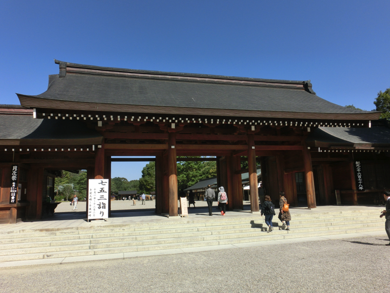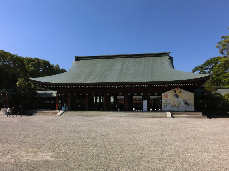 南神門前は、七五三の家族連れがちらほらといる程度。休みの日でもこんな感じならば、ゆったりできていいな。神門をくぐると広い神域があり、砂利が敷かれた神聖な雰囲気。その奥にあるのが外拝殿、その前には大きな絵馬があり、戌年の絵が描かれている。あと2ヶ月もすればお正月、この絵が亥年となり、たくさんの人が参拝に訪れるんだろうな。一般参拝客が入れるのはここまで、目の前は内拝殿が見えるが、この奥に本殿があるとのこと。ここのご祭神は神武天皇、初代の天皇陛下だ。神話の時代だけあって、神武天皇をご祭神としている神社はあとは宮崎神宮など、限られたところしかない。まさにここが日本の始まりの場所と言っても過言ではないということ。
