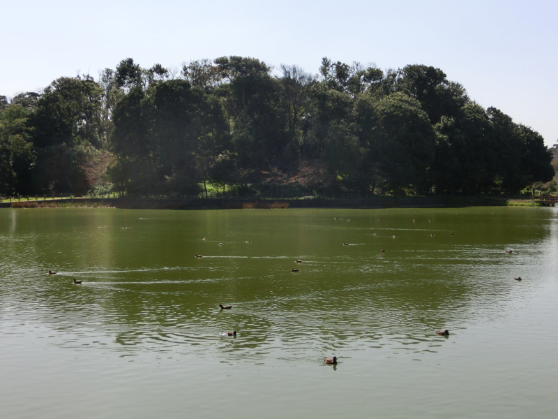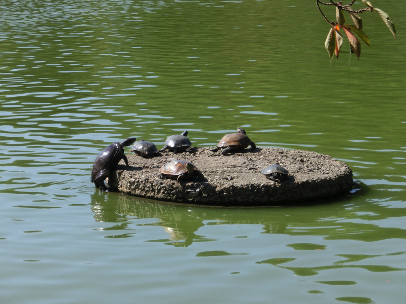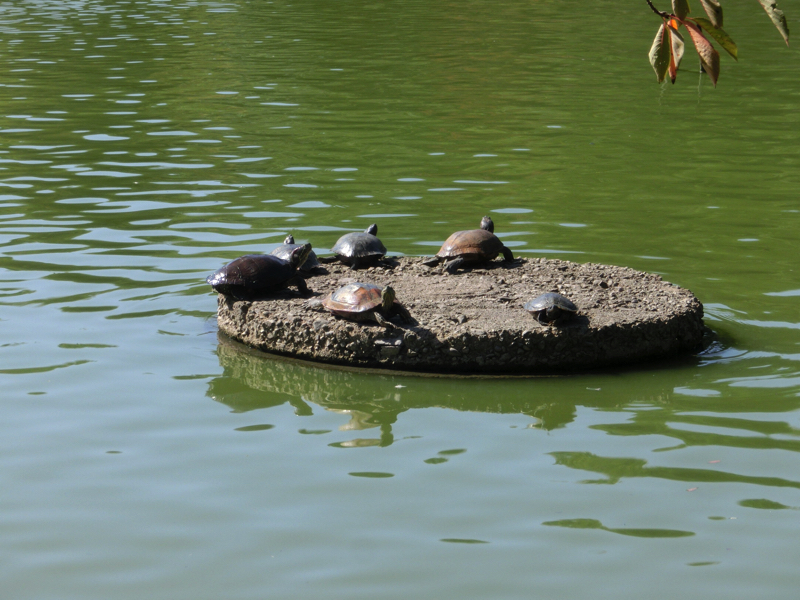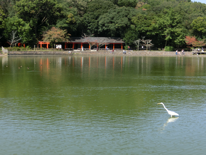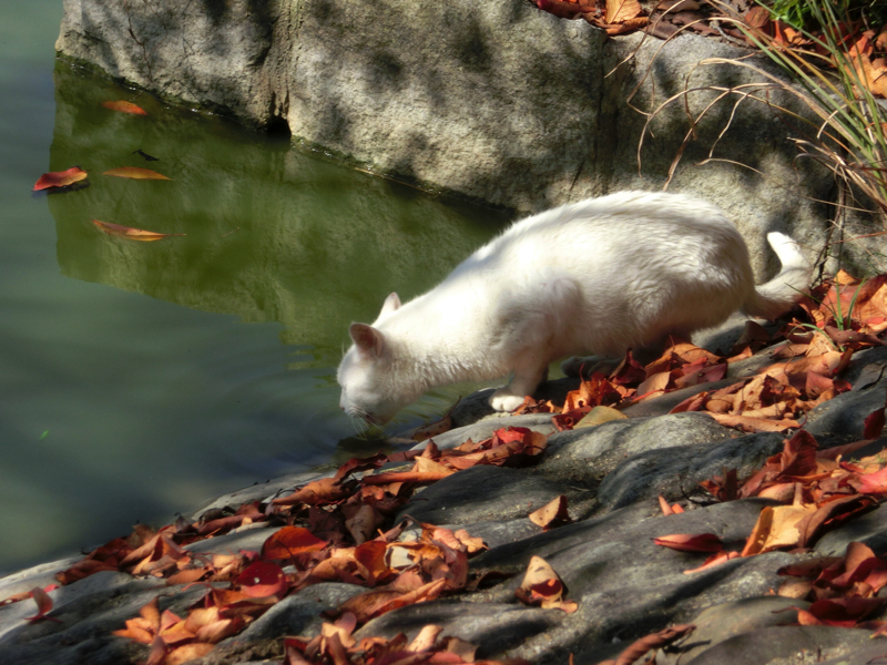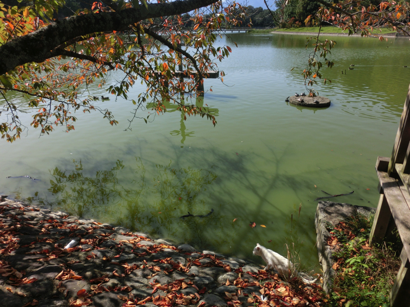 深田池には対岸までの遊歩道が整備されており、この晴天の中で気持ちいい散策ができる。池にはたくさんの水鳥がいて、穏やかないい景色だ。水面の石ではたくさんの亀が甲羅干ししていて、ちょうど登ろうと頑張っている亀がいました。なかなか登れないが何度目かのチャレンジでようやく登りきったが、どの亀も苦労して登っているんだね。あとは白い猫が、水を飲みに来ていました。魚を取ることもあるのかな?