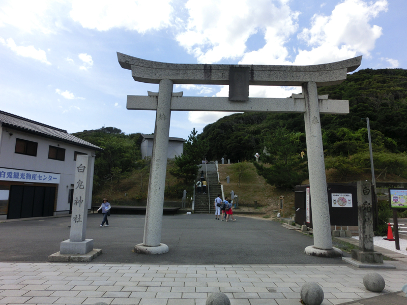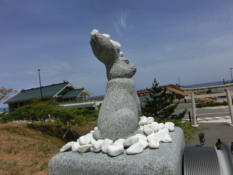 バスは最初の目的地、白兎神社に到着。ここは古事記や日本書紀にも記されている由緒の明らかな神社で、医療や縁結びの神様とのこと。ということで、鳥居の横にはピンク色のポストがあり、本殿までの参道脇にはいろんな姿をしたウサギの像がある。この像にうまく石を重ねておいていけばご利益があるらしい。ということで、どのウサギにもたくさんの石が置かれていて、なんだか不満そうなのもいて面白い。