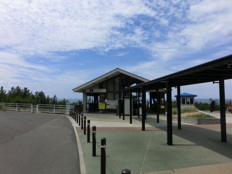 目の前に広がる日本海、いい景色だな。波打ち際にも何人か人がいるが、ここを降りたら登らないといけないのでほとんどの人はここまでかな。もちろん我々も。では戻りますか。丘を降りるのは簡単だが、そのあとリフトまではなだらかな坂道で意外と疲れました。この往復は、もう少し年取ったら本当に厳しいかも。リフトに乗って砂丘センター前まで戻るが、途中に写真を撮られる場所があった。ディズニーランドなら買うかもしれないが、ここじゃ別にいらないな。リフトに乗ってる写真だしね。