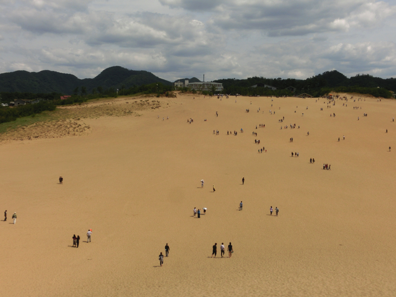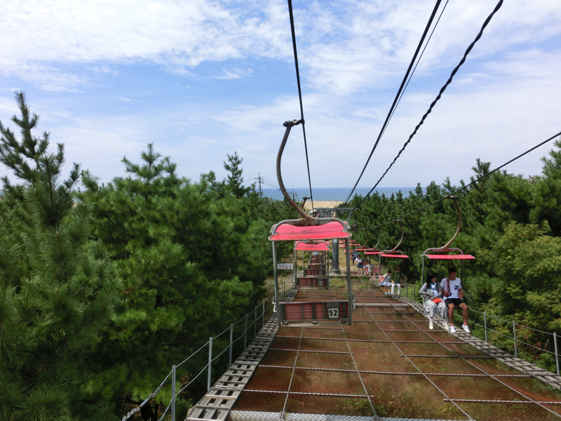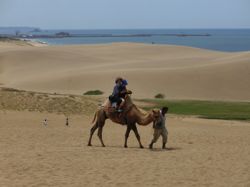 砂丘へはリフトで向かう。一体いつだろうか、スキー以来久しぶりに2人用のリフトに乗る。風が感じられて気持ちがいいな。砂丘側へ到着すると、そこにはラクダがいました。月の砂漠のイメージかな。でもこのラクダを写真に撮るのは有料らしいので、遠くからこそっと。この辺りには写真を撮るための台などもあってそこにも有料と書いてあるのだが、これは誰に払うんだろうか。写真撮ってたら集金部隊が近づいてくるのかな。