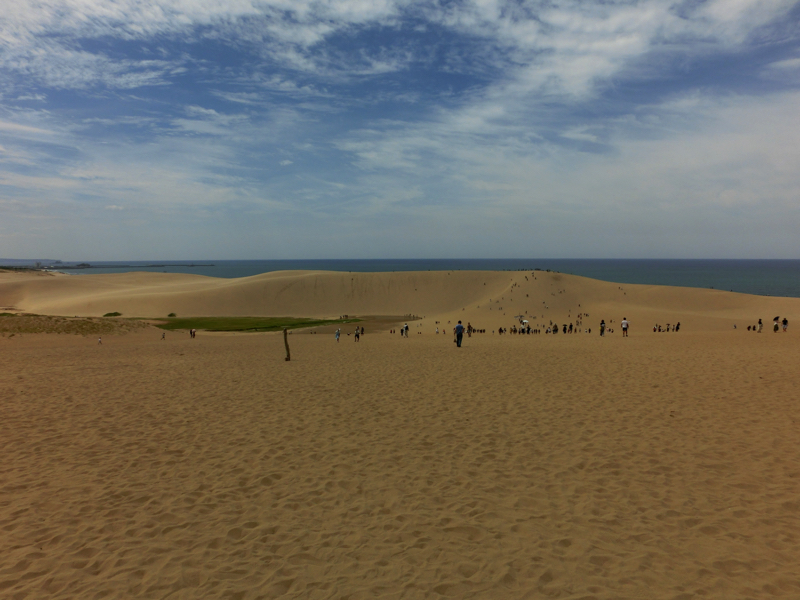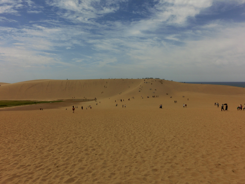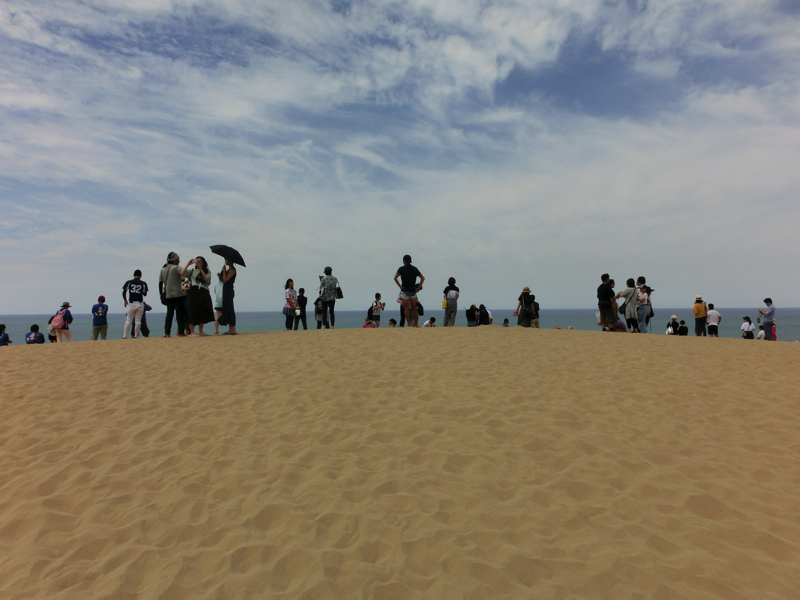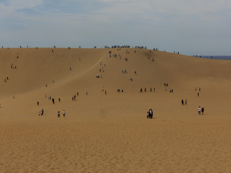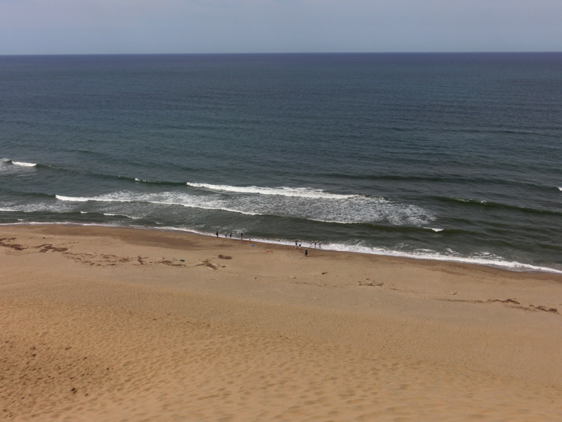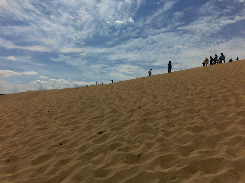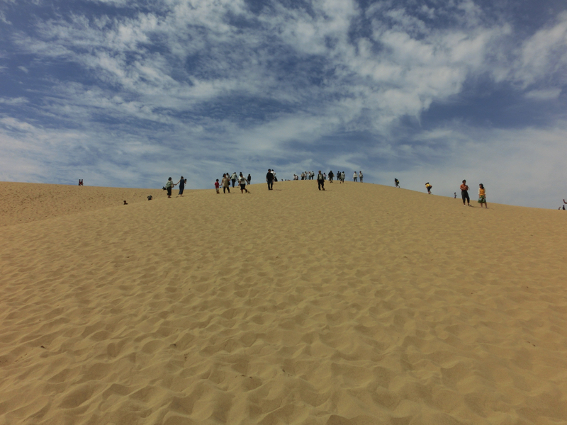 砂丘の向こうには海が見える。よし、行くか。たくさんの人が砂丘の頂上を目指して歩いている。さほど距離もないし高さもないはずだが、ここは砂丘、さらさらの砂に足を取られるのでどうも歩きづらい。登っていくためには足を踏ん張るのだが、その足元がしっかりしていないので力が余計にかかってしまう。汗をかきながらようやく丘の頂上に到着、予想以上にハードでした。でも一面に海が広がり、風が心地よい。