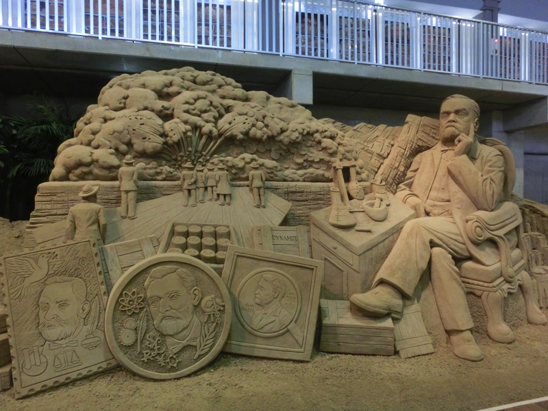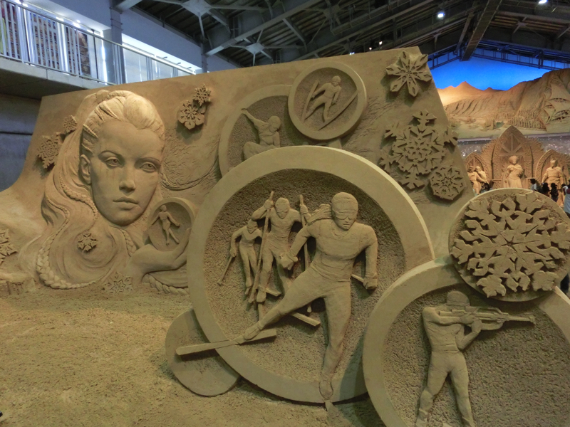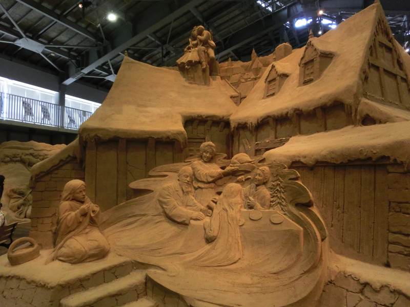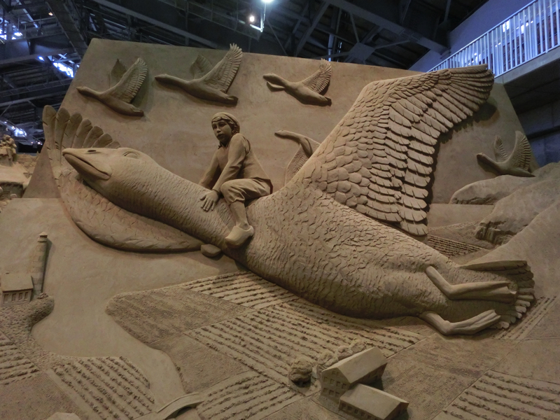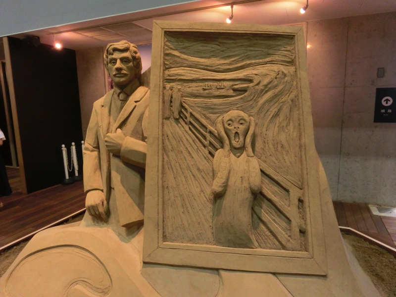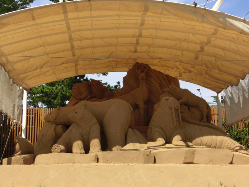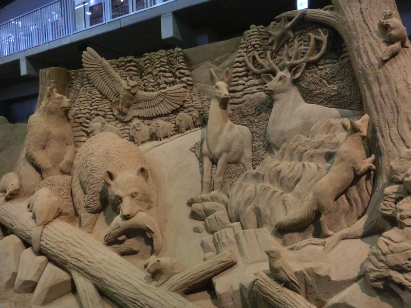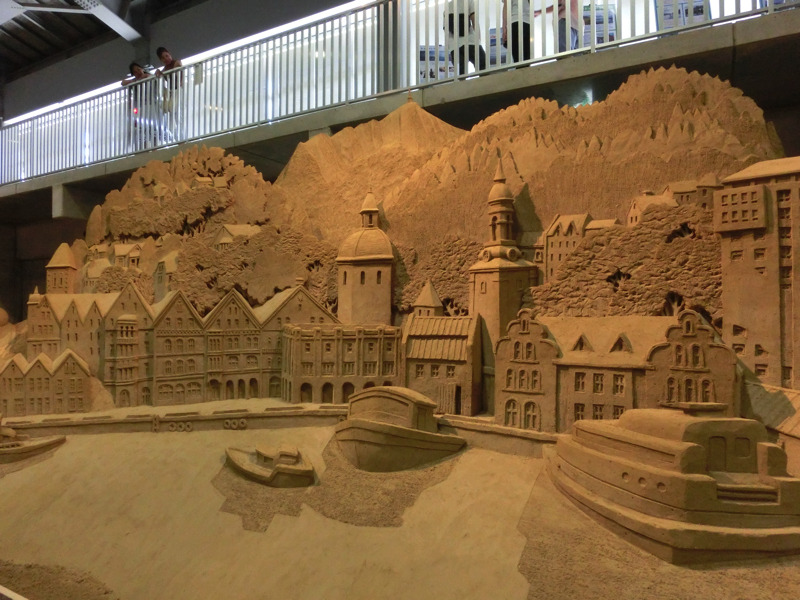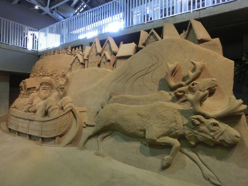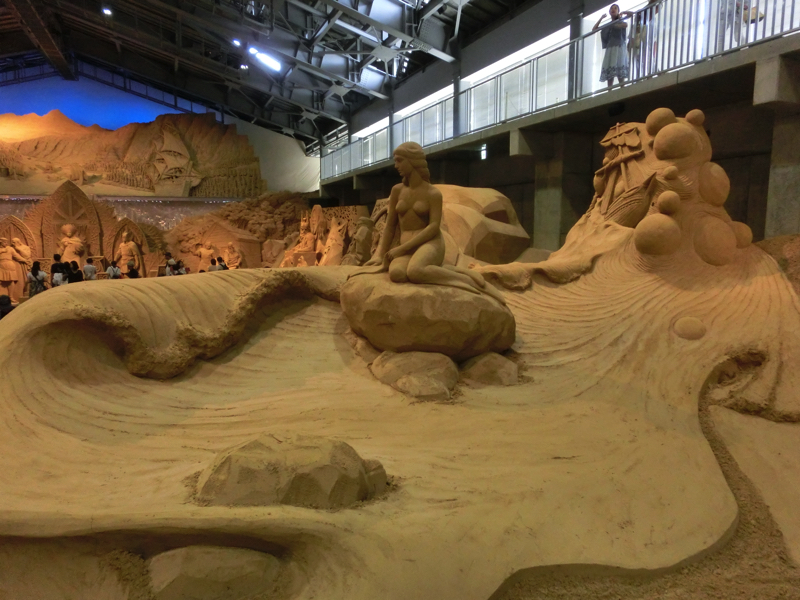 あと40分ちょっとほどしか時間がないが、砂の美術館へと行こう。ここは砂丘の砂を固めた像が展示されていて、今のテーマは北欧。雪まつりの砂バージョンですね。園内に入るとまず大きな動物の像が。これが砂でできているのはすごいなあ。少し歩くと大きな建物があり、その中にたくさんの像がありました。マッチ売りの少女のように物語を元にしたもの、ベルゲンや人魚像のように観光地を元にしたもの、シロクマやトナカイなどの動物を元にしたものなど、どれもしっかりと作られている。