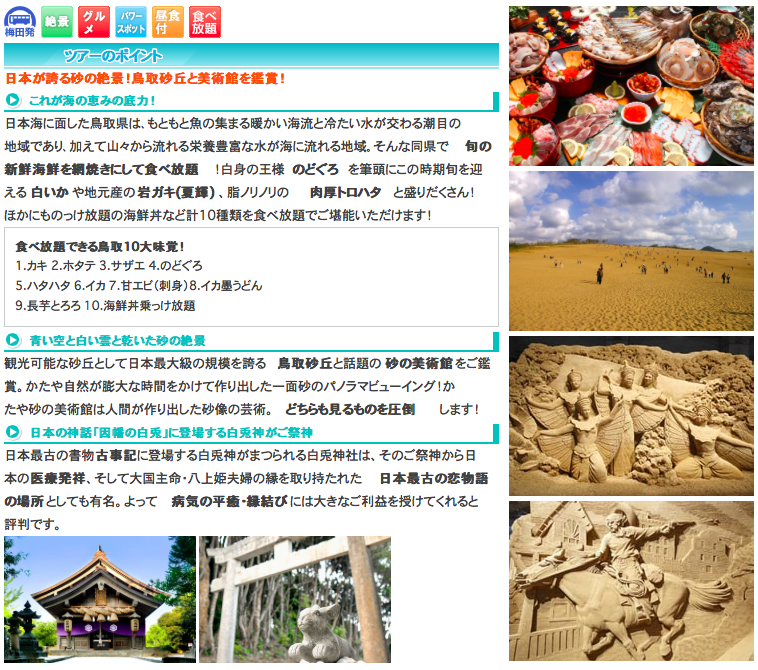 バスは海岸沿いを走り、その後坂道を登っていく。途中で海、そして砂丘が見えてきた。登りきったところにあるのが砂丘センター。お土産やさんがあるこの建物の二階がお食事どころ。今日はたくさんのツアーがくるようで、お昼時ということもありたくさんの料理がセッティングされていました。今から食事・砂丘見学・砂の美術館で150分間。これは結構忙しいぞ。このツアーは「10種の味覚食べ放題」ということで、とりあえず一式は一人ずつセットされているがおかわりは自由。とはいえ網が小さいので、カキやホタテ、サザエなどは同時にはそれほど焼けないな。まあ、これら貝類はある程度ボイルされているとのことで火が通れば食べられるのだが、その分味はそれなり。それよりもここは山陰らしくのどくろかな。小ぶりなのですぐ火が通るし、これはやっぱりおいしいです。あとは海鮮丼、焼かなくてもいいので刺身としてどんどん食べる。白身の魚がおいしく、何度もおかわり。のどぐろもおかわり。たっぷり食べて、満足です。ただ、イカスミうどんだけはいまいちだったかな・・ごちそうさまでした。では砂丘へと行きますか。ここまで約1時間が経過、あと約90分。