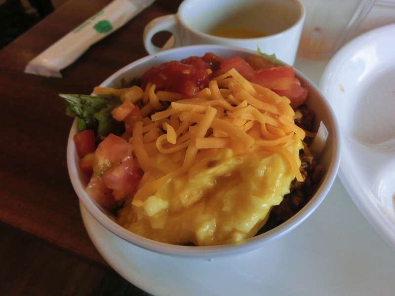 8時過ぎに朝ごはんへ。野菜たっぷりの朝ごはんをいただくが、ここはタコライスが作れる。ご飯にゴーヤなどの野菜をのせ、スパイシーなひき肉をのせ、あとはチーズとサルサソース。これをしっかり混ぜていただきます。確かに具はタコスだが、ご飯にほどよい辛さといろんな野菜、そしてひき肉が混じり合った感じがおいしいです。少しスクランブルエッグを混ぜてみたのがいいまろやかさにもなったしね。食後のヨーグルトに入れたマンゴーは半分凍ってる・・これもまたよし。ごちそうさまでした。