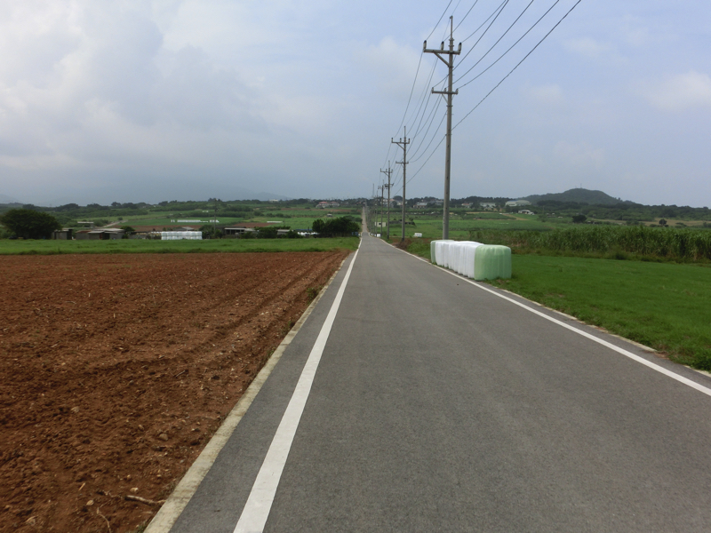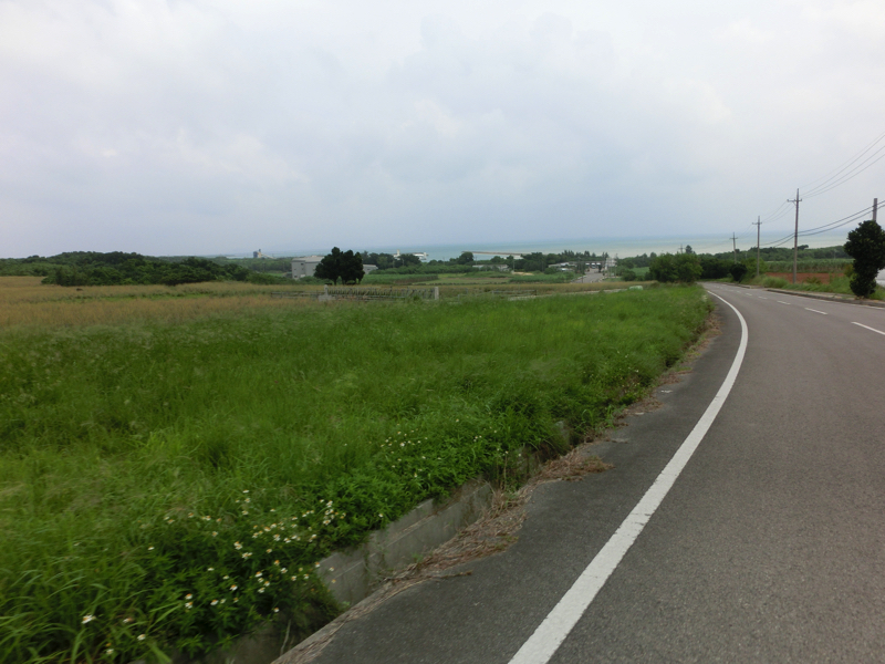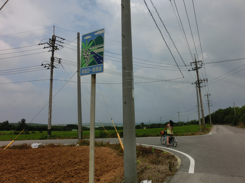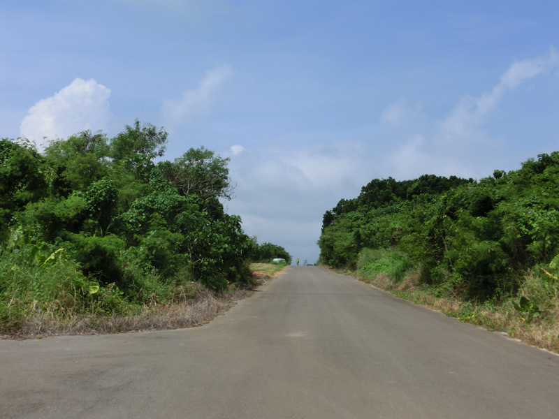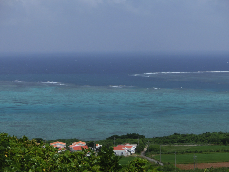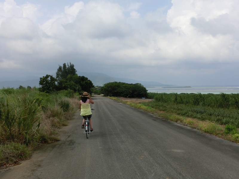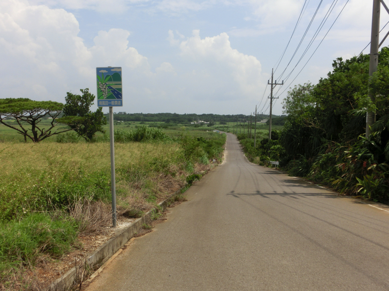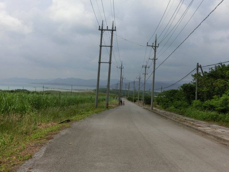 集落から出て、次の目的地として案内されていたのは**。岬からは西表島がよく見えるらしいが、天気がこれではそこまでの景色は期待ができない。かなり距離もあるので、そこまでいかなくてもいいか。それよりちょっと休憩したいので、はいむるぶしへと向かいましょう。途中にはほぼ一直線の緩やかな下り坂の道があり、海も見えてサイクリングには気持ちいい。牛の姿が所々にみえるのも面白い。